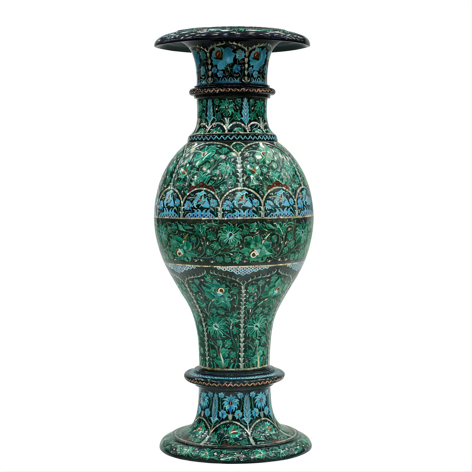 Made from premium green marble, the vase showcases a richly detailed all-over floral vine pattern, enhanced with symmetrical Mughal-inspired motifs. The deep green base combined with intricate inlay work creates a regal and sophisticated aesthetic, ideal for luxury interiors.
