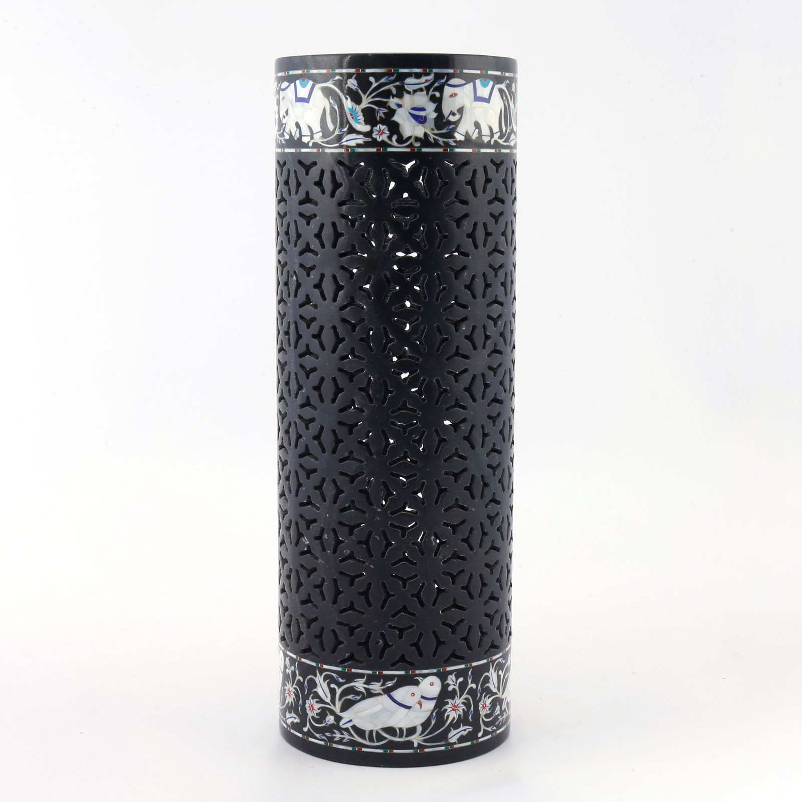 Make a bold and sophisticated statement with this handcrafted black marble Jali flower vase, a striking fusion of traditional Indian craftsmanship and contemporary luxury. Sculpted from premium-quality natural black marble, this tall cylindrical vase features finely executed hand-carved Jali (lattice) work, giving it a rich texture and dramatic visual depth.