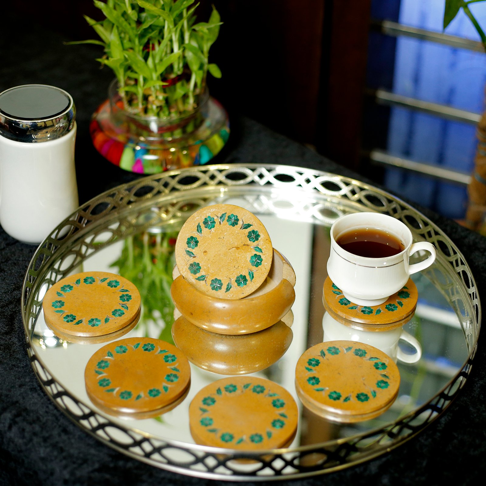 This elegant handcrafted marble inlay coaster set beautifully represents the heritage artistry of Agra’s traditional Pietra Dura (stone inlay) craft. Made from premium natural brown marble, the set features a refined circular floral arrangement that reflects understated luxury and timeless design.
