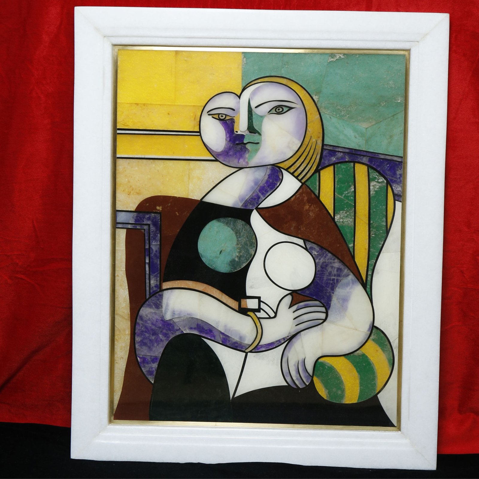 Introduce a statement of modern sophistication with this handcrafted marble inlay abstract figurative wall art, a refined interpretation of contemporary cubist aesthetics executed in traditional Pietra Dura (stone inlay) technique. Elegantly set within a premium white marble frame, the artwork features a stylized abstract figure composed of bold geometric forms and harmonious color blocks.