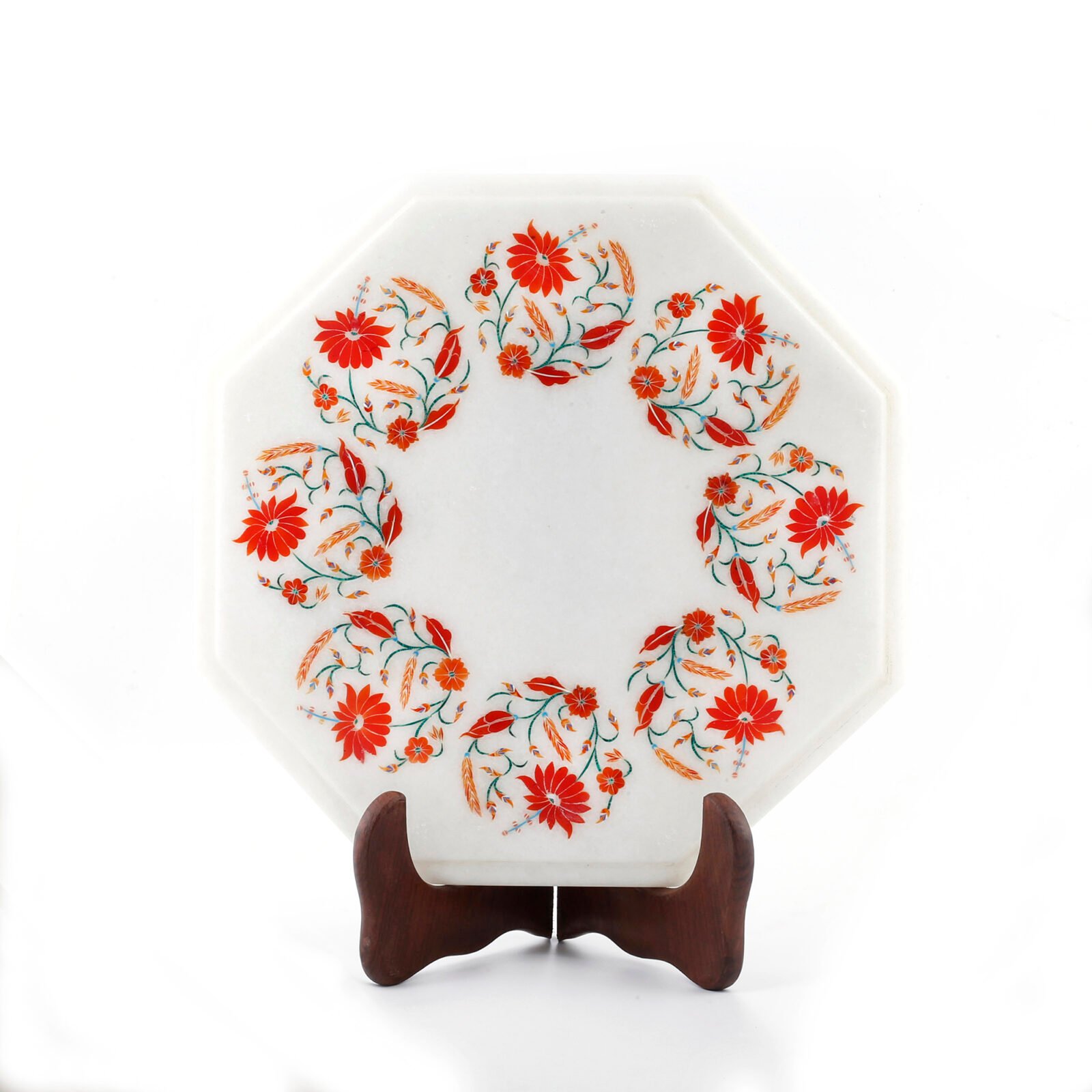 Enhance your space with timeless elegance through this exquisitely handcrafted marble inlay decorative plate, a refined expression of Agra’s legendary Pietra Dura craftsmanship. Carved from pure natural white marble, this octagonal plate features a harmonious floral inlay design, meticulously hand-set using semi-precious stones in rich, vibrant tones.