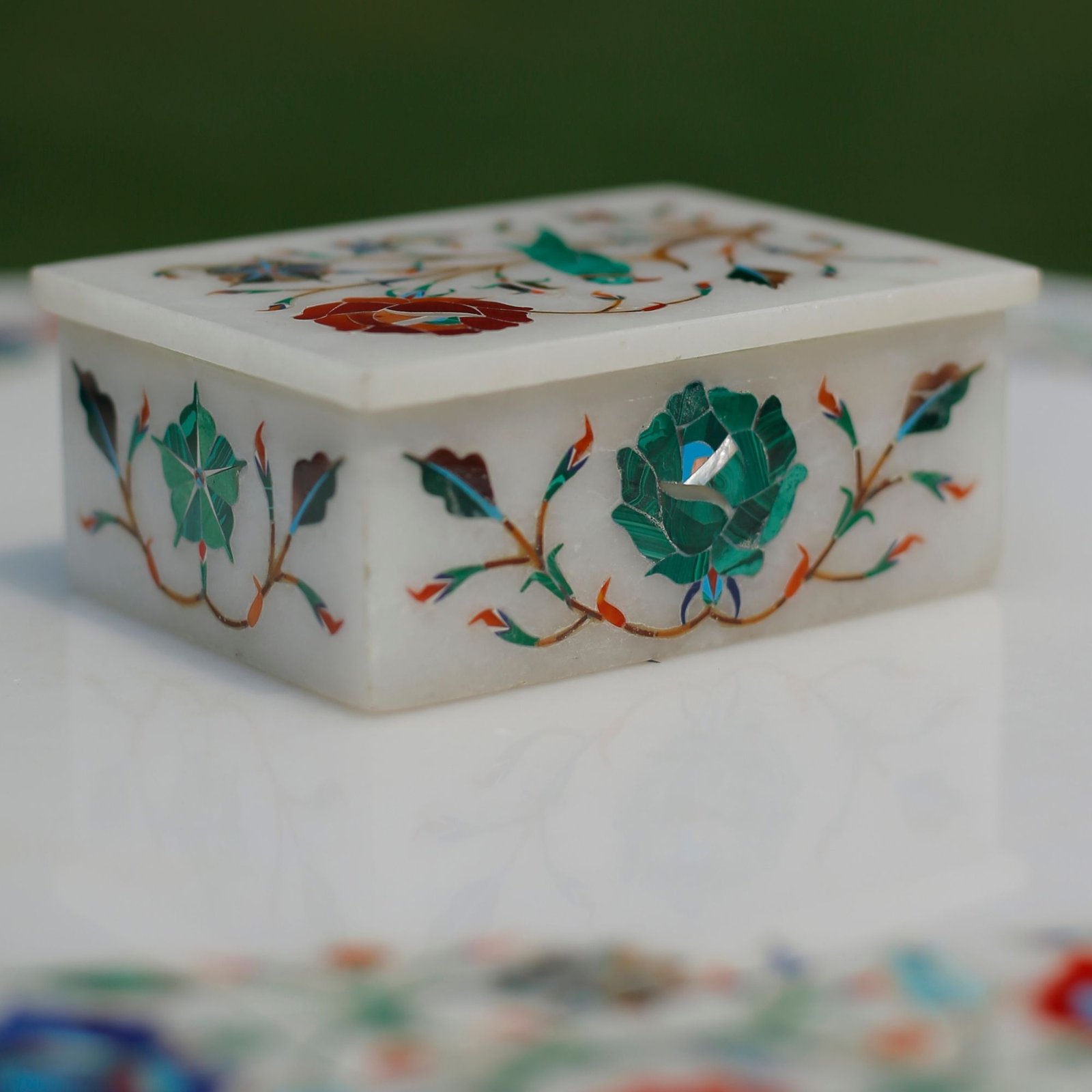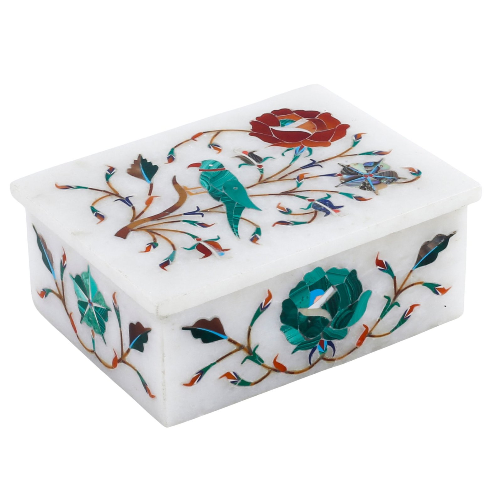 Handcrafted Marble Inlay Jewellery Box with Bird & Floral Design | Pietra Dura Box Using Semi-Precious Stones