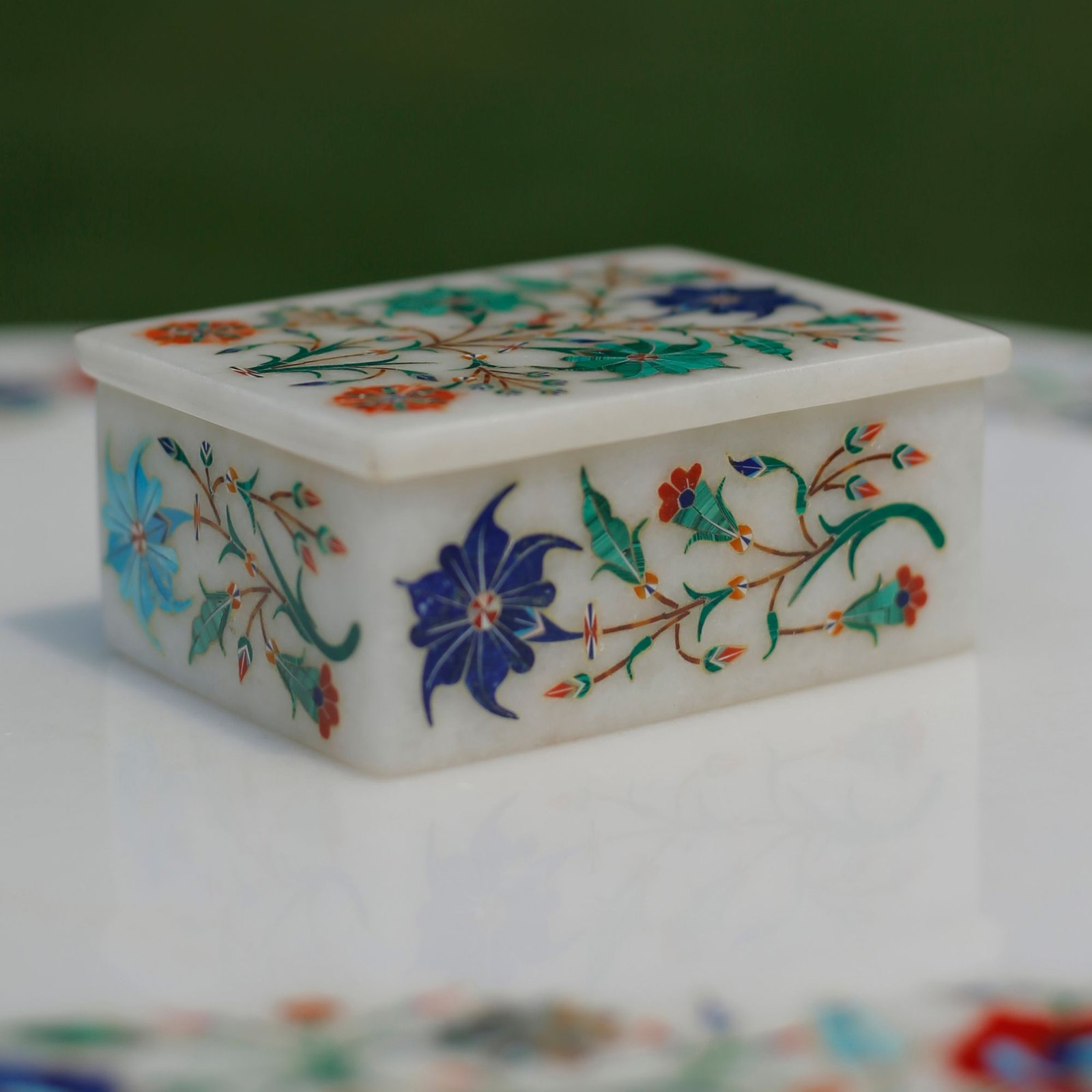 The intricate inlay work is created using natural, hand-cut semi-precious stones, carefully shaped and embedded into the marble surface: