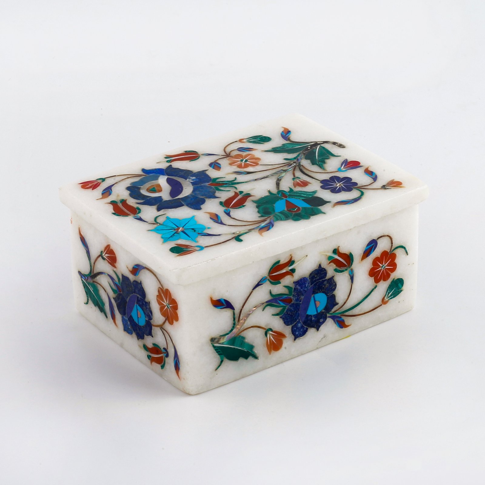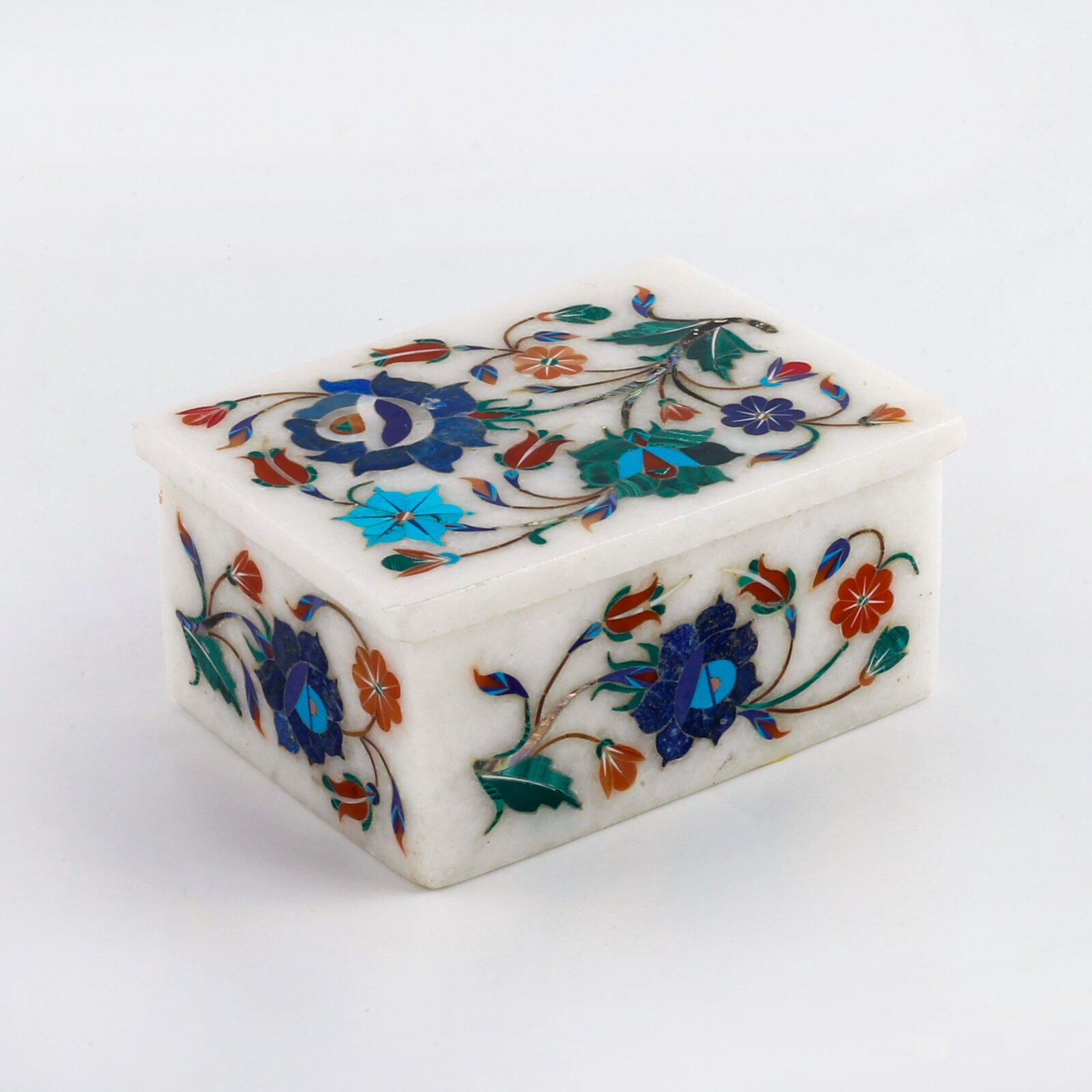 Preserve your precious treasures in timeless elegance with this exquisitely handcrafted marble inlay jewellery box, a perfect blend of beauty, heritage, and functionality. Carved from pure natural white marble, this box is adorned with intricate Pietra Dura (Pachhikari) floral inlay work, meticulously created using semi-precious stones in rich, vibrant hues.