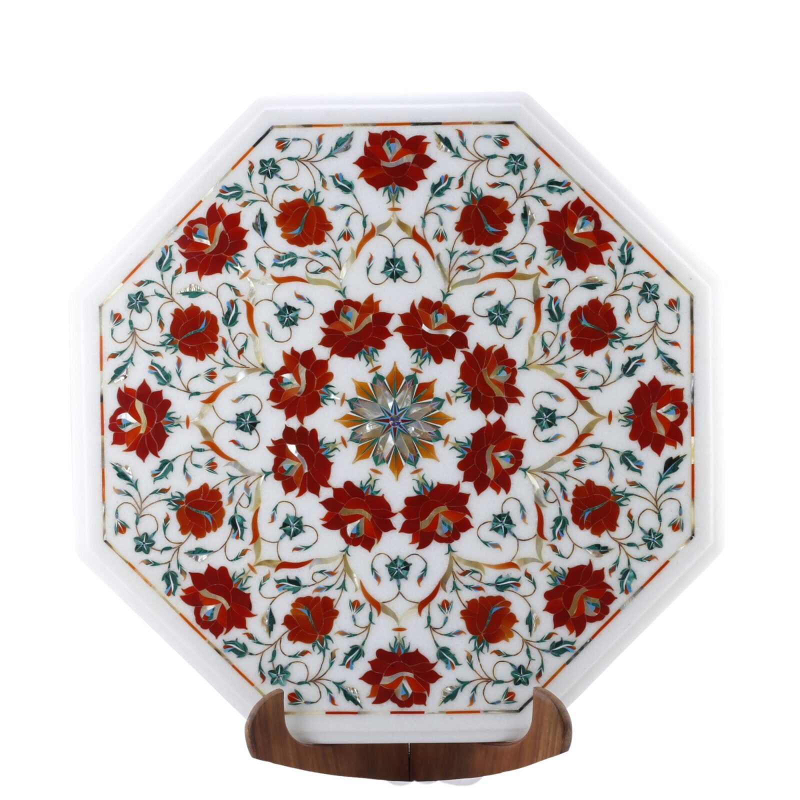 This striking handcrafted marble inlay table top is a beautiful example of traditional Pietra Dura craftsmanship, featuring a bold and elegant red floral composition. Crafted from premium white marble, the octagonal surface is richly decorated with a repeating floral vine pattern, carefully inlaid by hand using natural semi-precious stones.