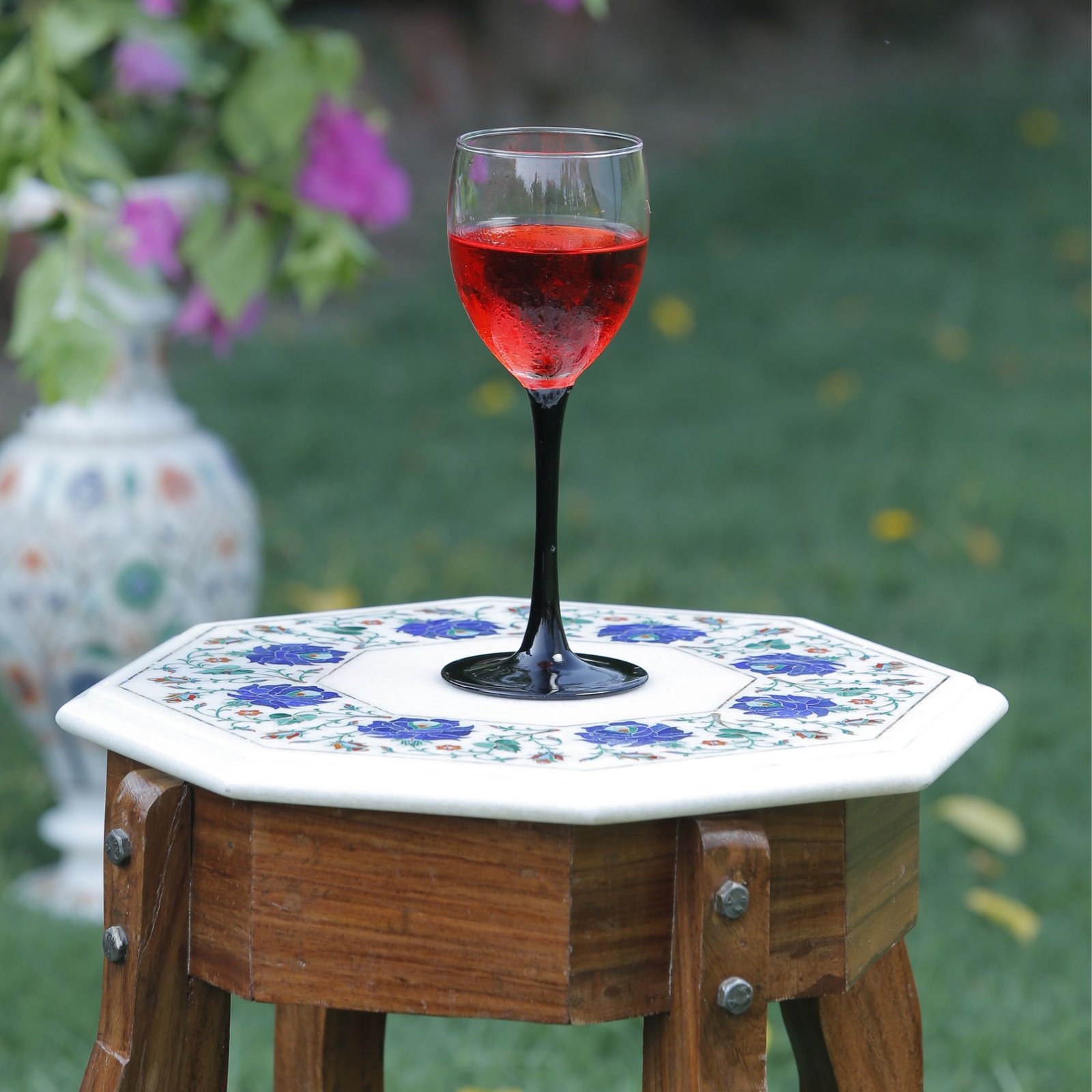 The floral inlay work is created using carefully selected natural semi-precious stones, chosen for color vibrancy and durability: