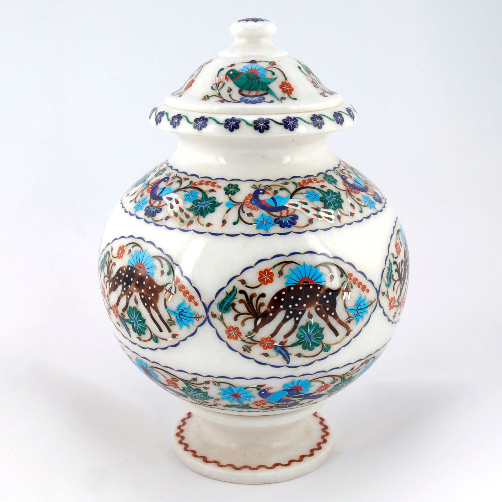The surface is richly decorated with hand-inlaid peacock and deer motifs, symbolizing grace, beauty, and harmony in Indian art. Each motif is framed with flowing floral patterns and ornamental borders, meticulously created using natural semi-precious stones, precisely set into the marble base by skilled artisans.