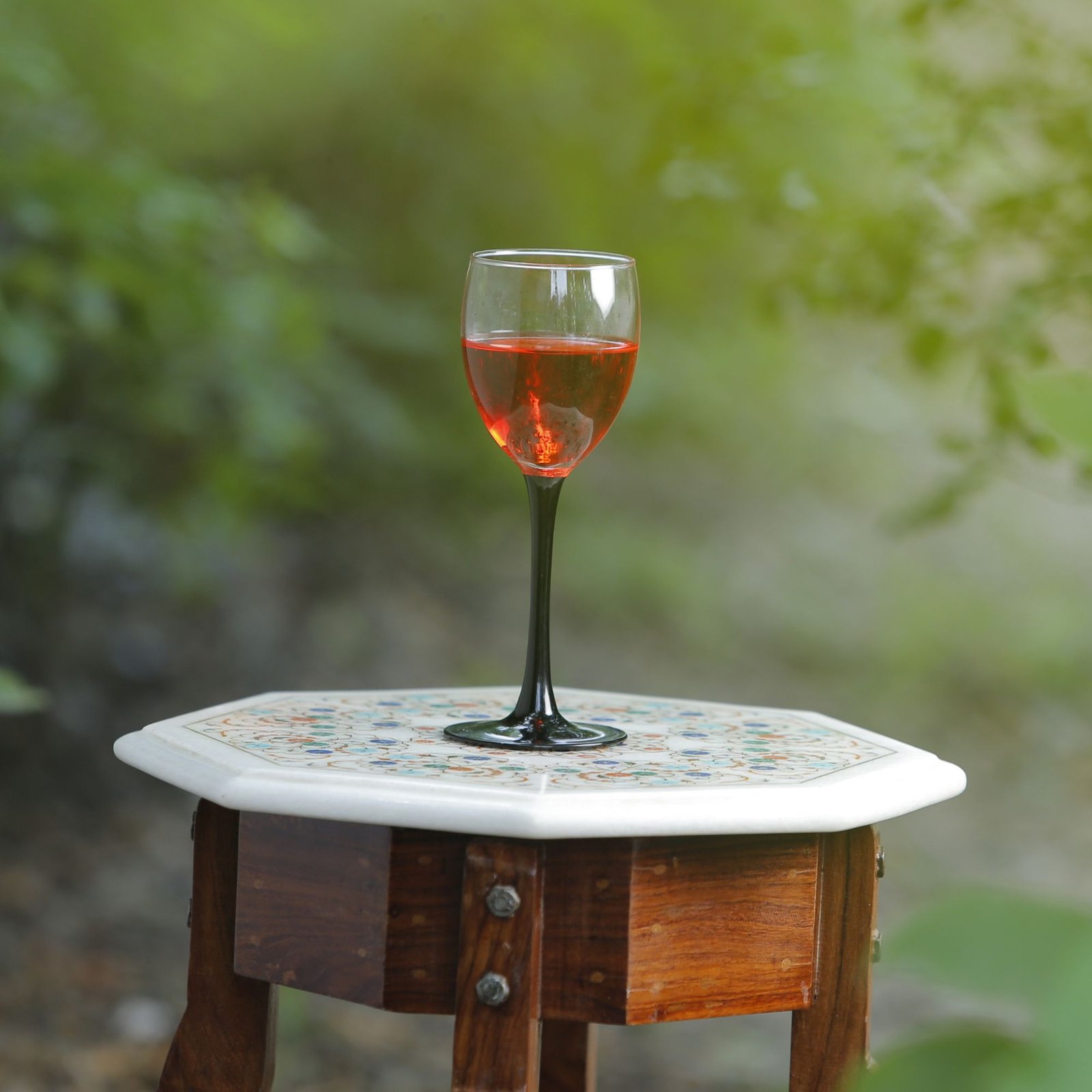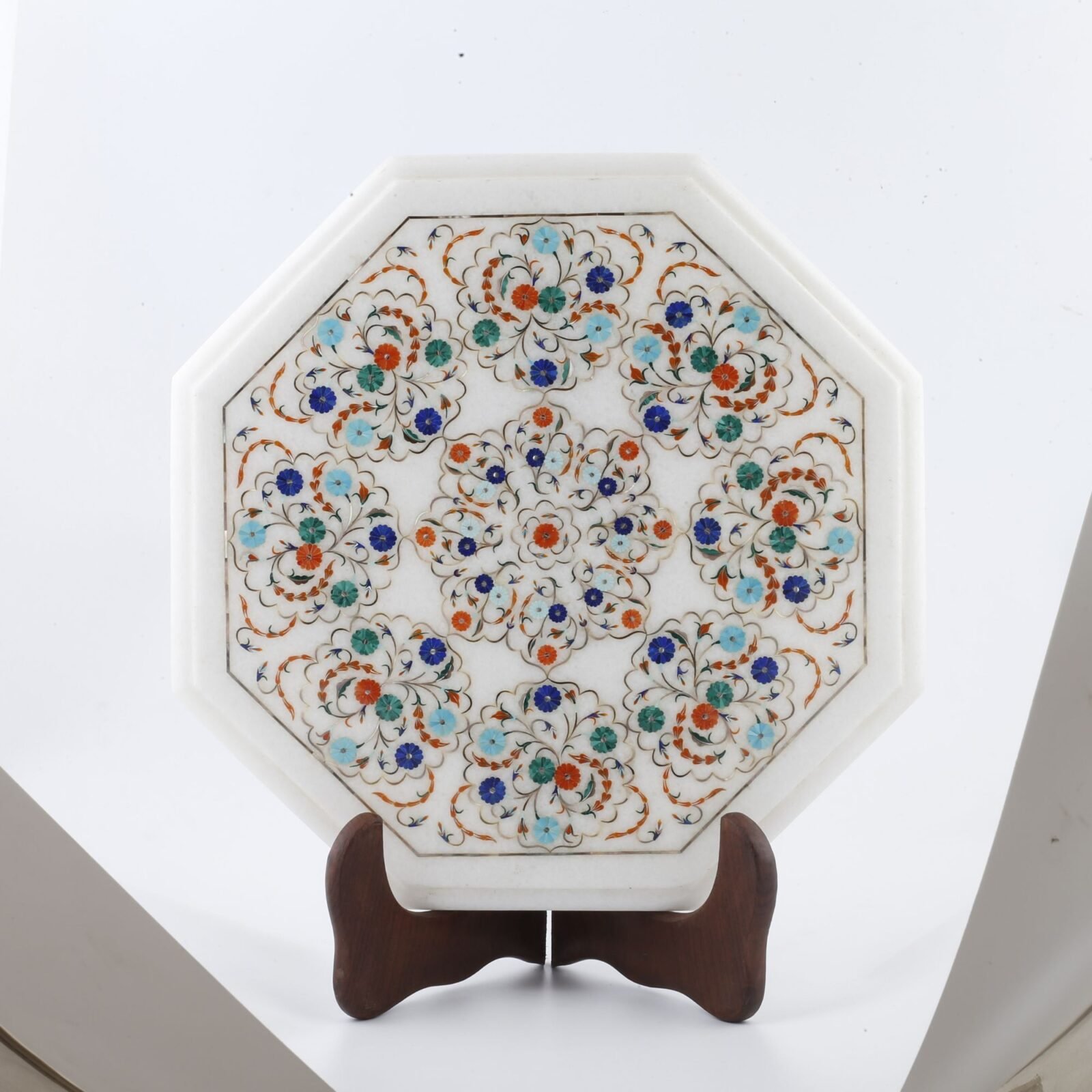 The inlay work is created using carefully selected natural semi-precious stones, individually hand-cut and precisely fitted into the marble surface: