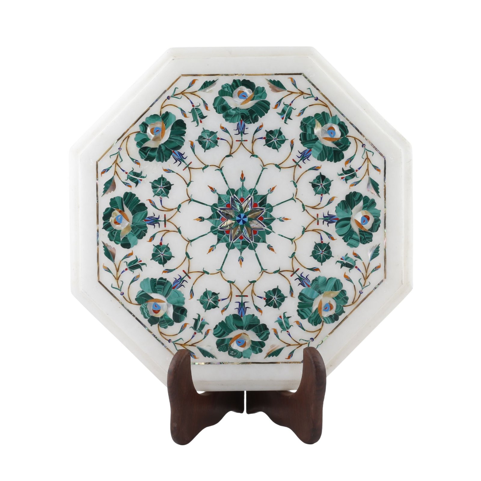 The table top features a carefully selected palette of semi-precious stones, chosen for their natural beauty and durability: