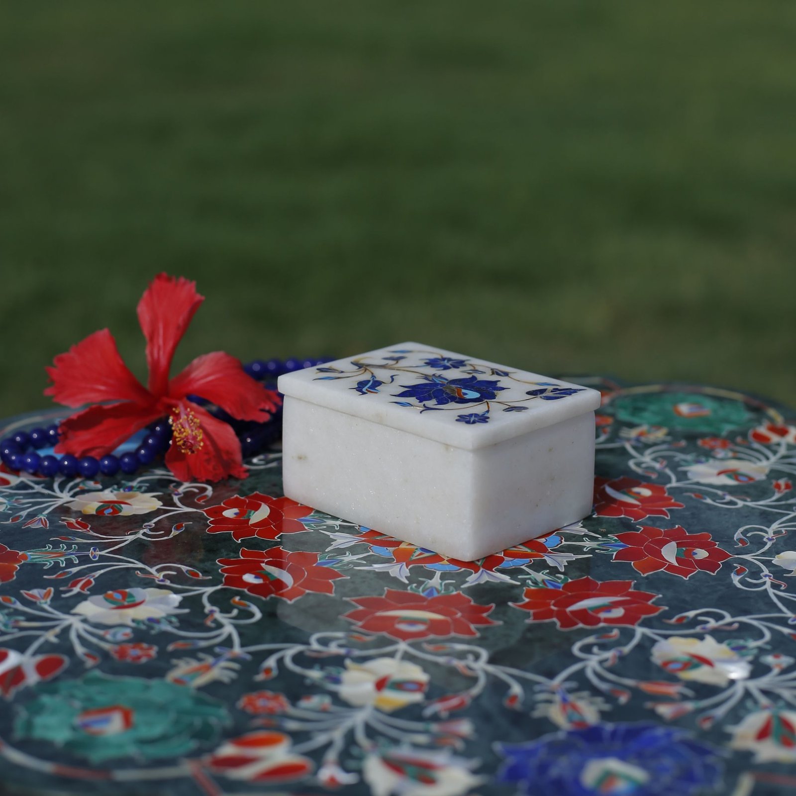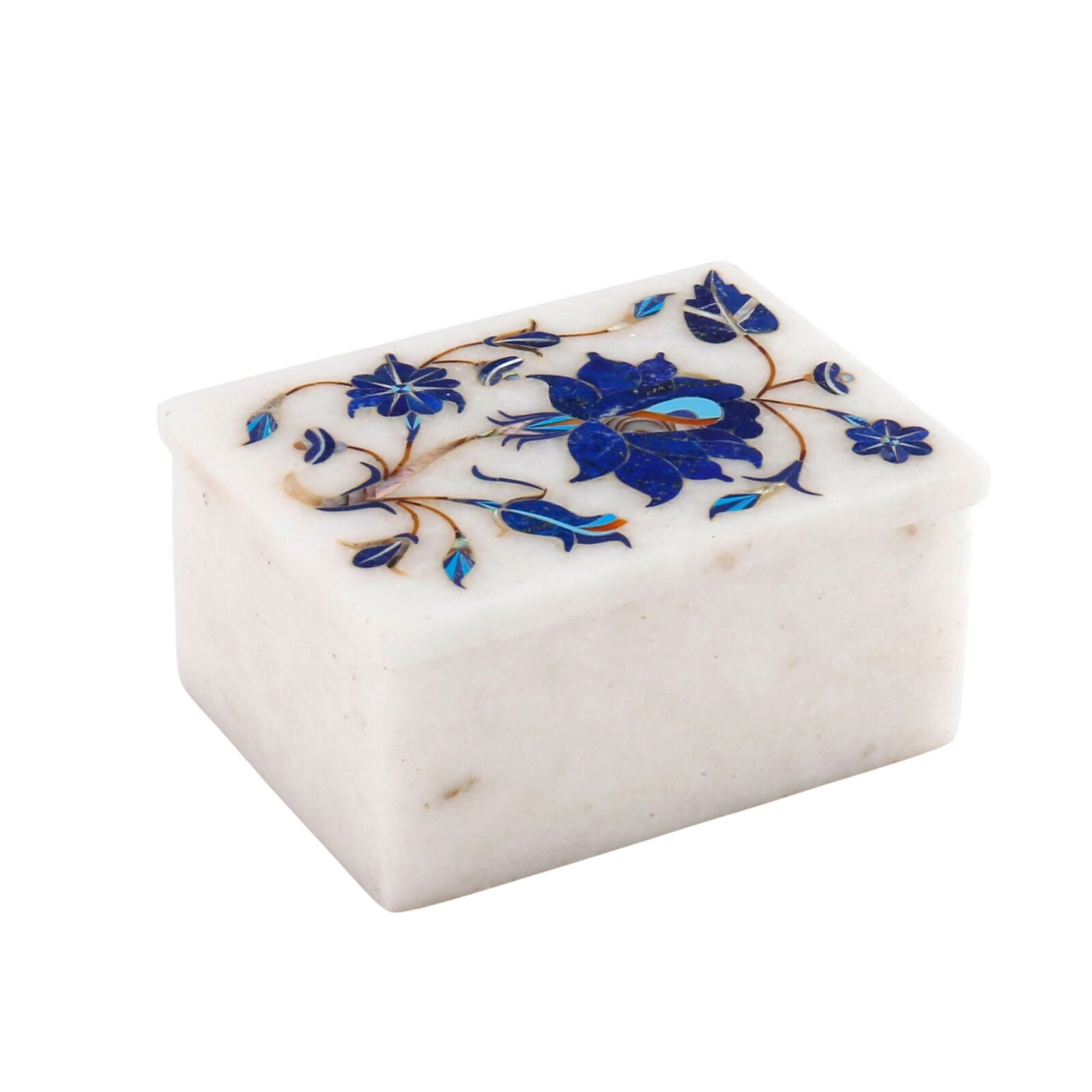 Handcrafted Marble Jewellery Box with Blue Floral Semi-Precious Stone Inlay | Luxury Pietra Dura Trinket Box from Agra