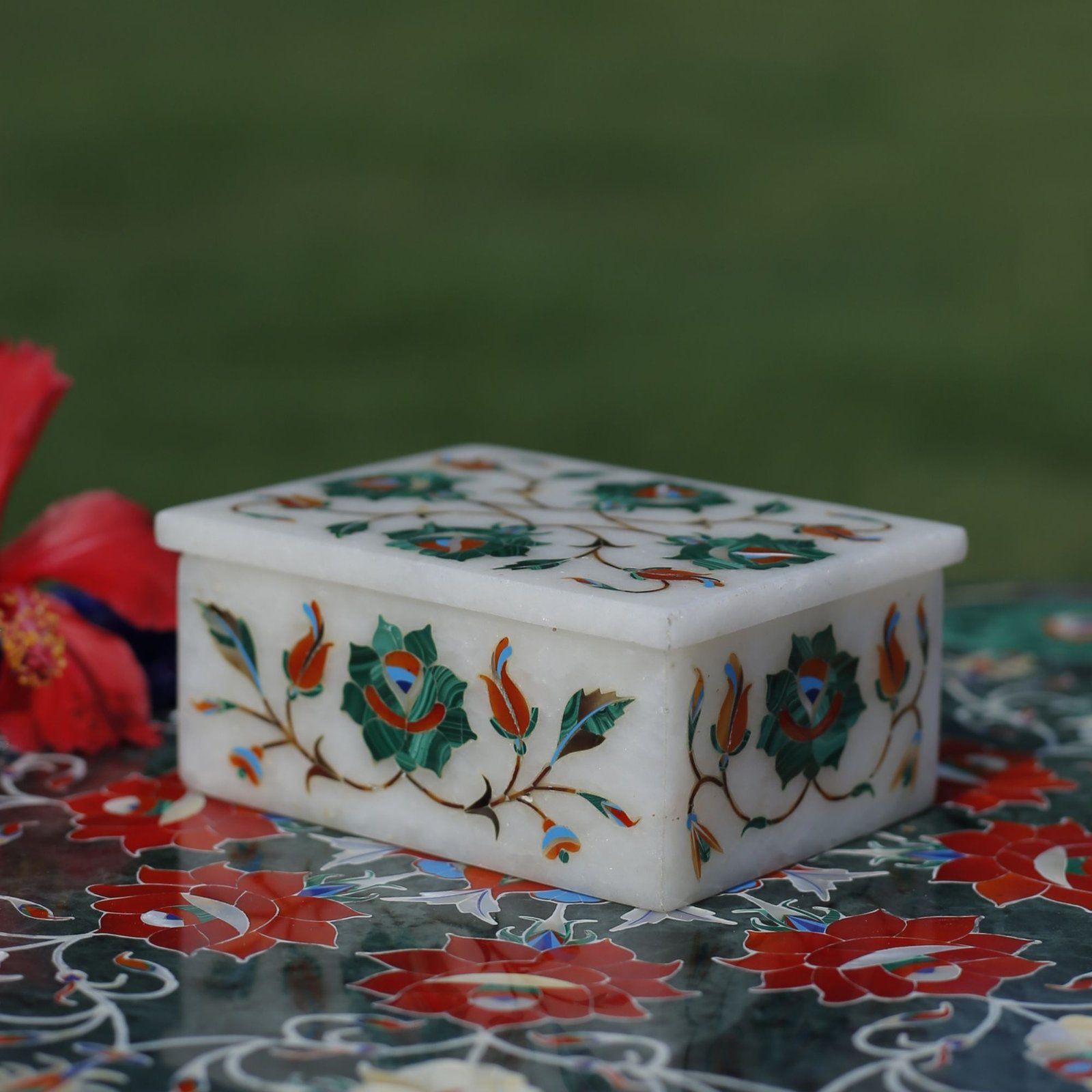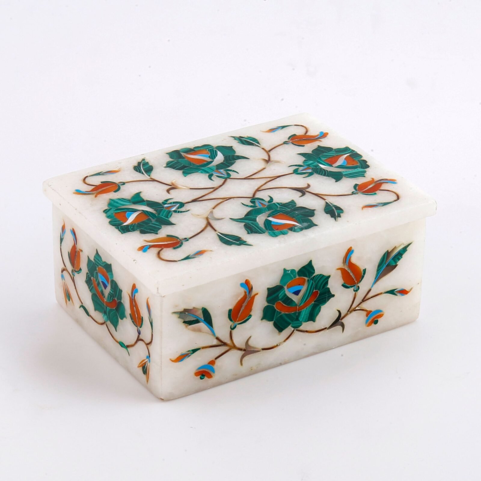 Each stone is individually shaped, polished, and inlaid into the marble, ensuring durability, color depth, and a premium finish.