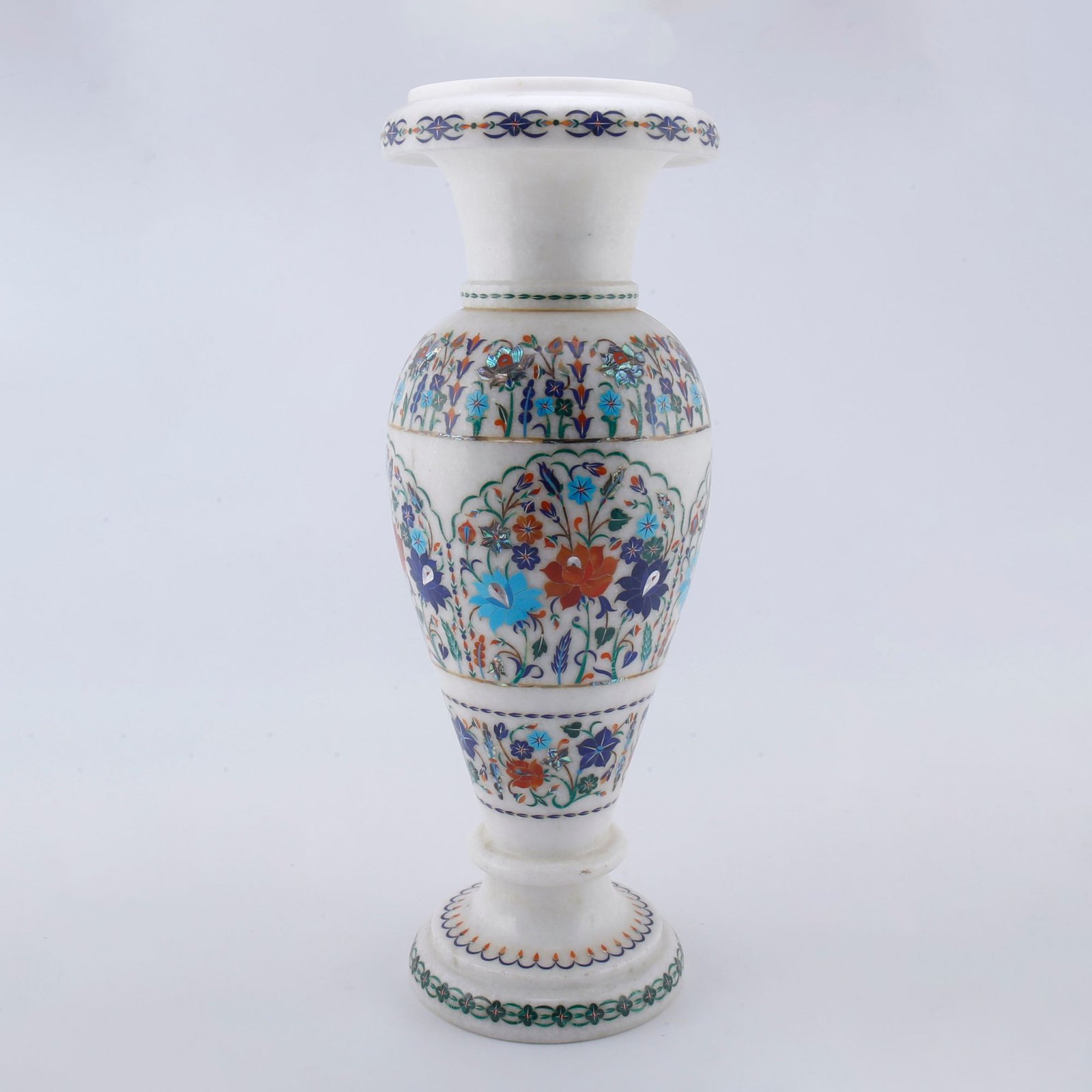 Add timeless elegance to your living space with this handcrafted marble inlay flower vase, a refined example of traditional Indian Pietra Dura artistry. Carefully sculpted from high-quality white marble, this vase showcases intricate multicolor floral and vine motifs, meticulously created by skilled artisans using age-old inlay techniques