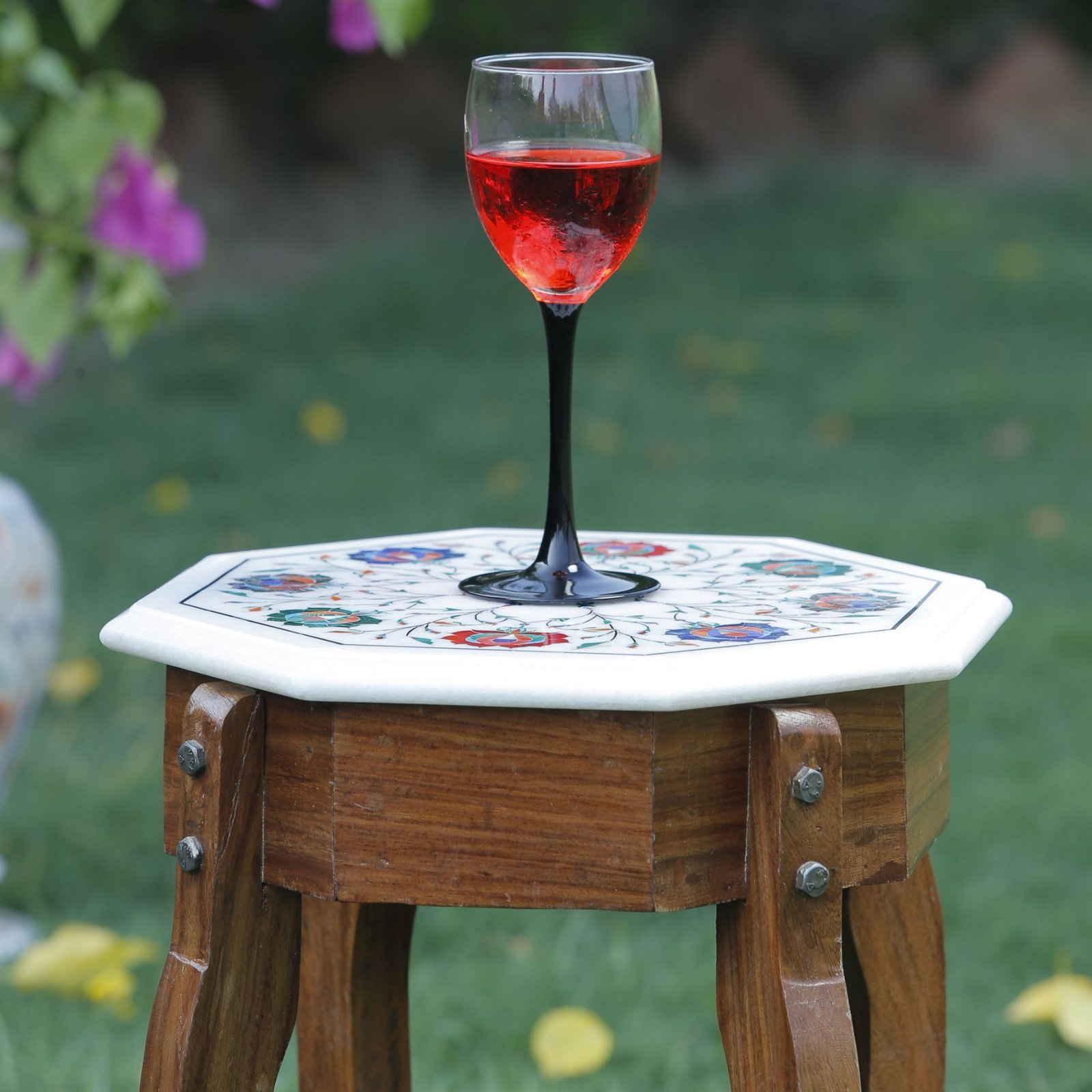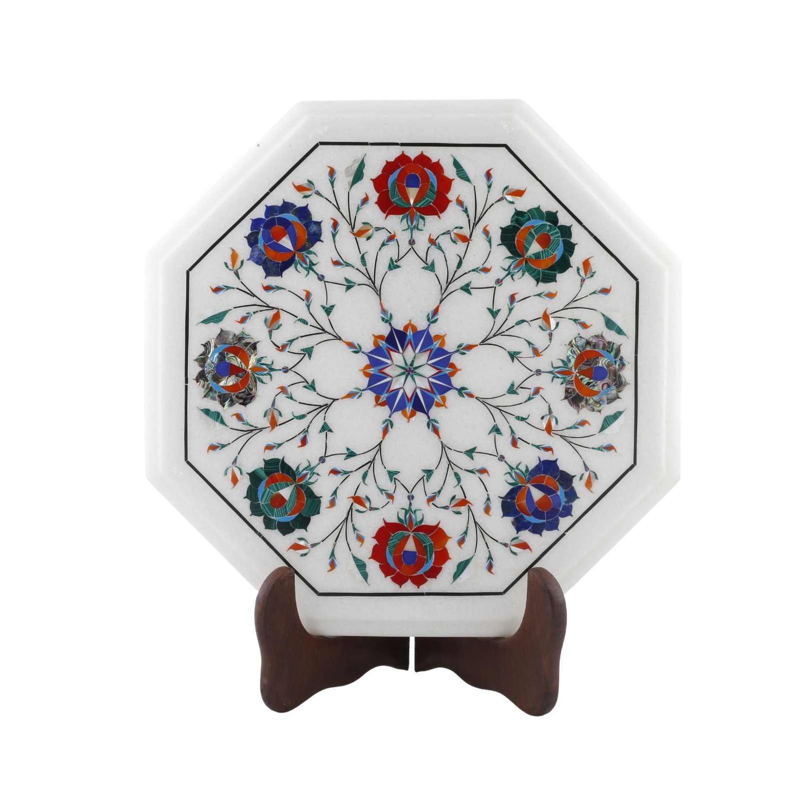 Introduce timeless elegance to your décor with this handcrafted marble inlay table top, inspired by the grandeur of Mughal-era pietra dura artistry. Crafted from premium white marble, the octagonal surface showcases a striking central star medallion, encircled by balanced floral motifs and delicate vine detailing, all meticulously laid out in perfect symmetry.