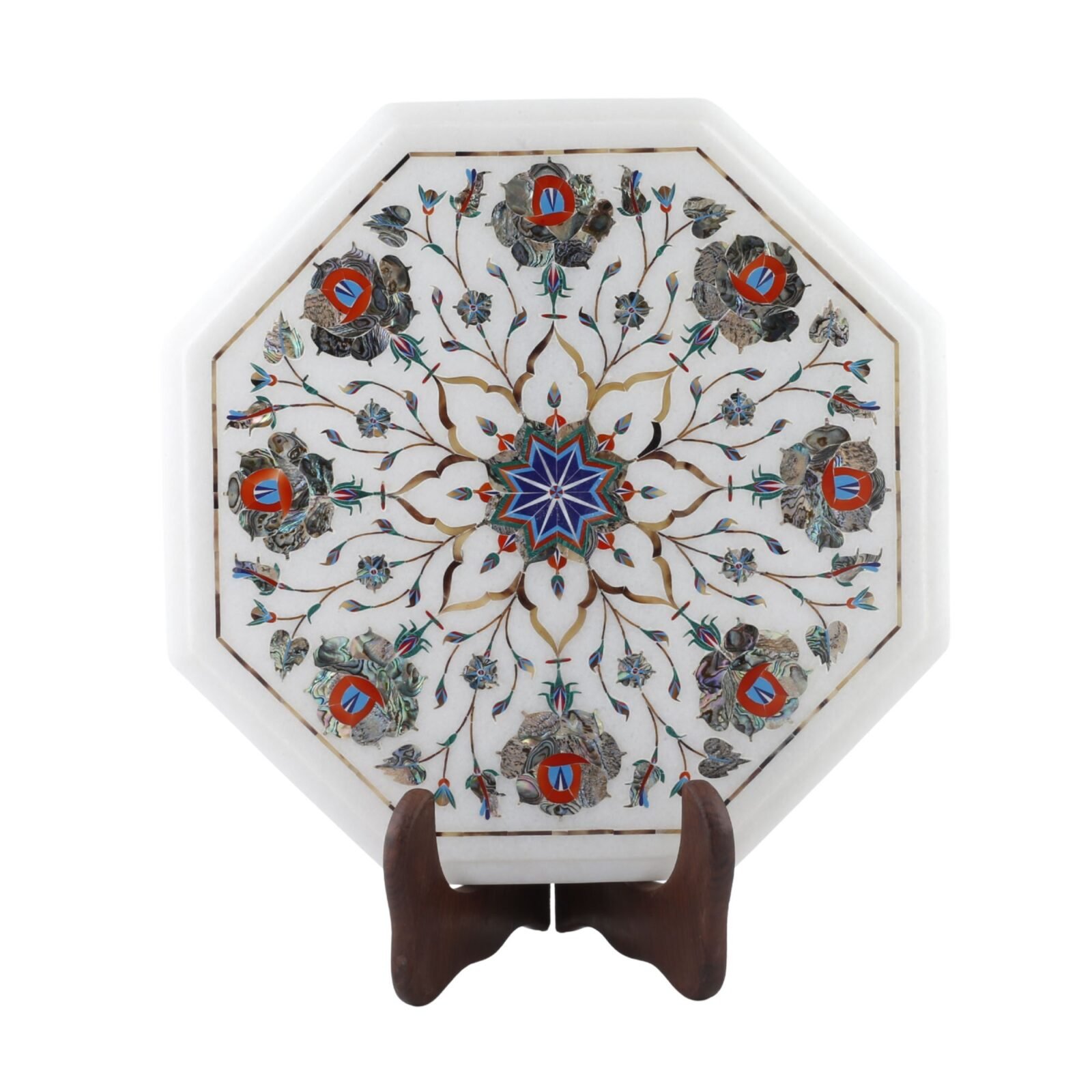 This handcrafted marble inlay table top is a striking representation of classical Indian pietra dura artistry blended with geometric elegance. Crafted from premium white marble, the octagonal surface showcases a finely detailed central star medallion, surrounded by symmetrical floral and vine patterns inspired by Mughal architectural design.
