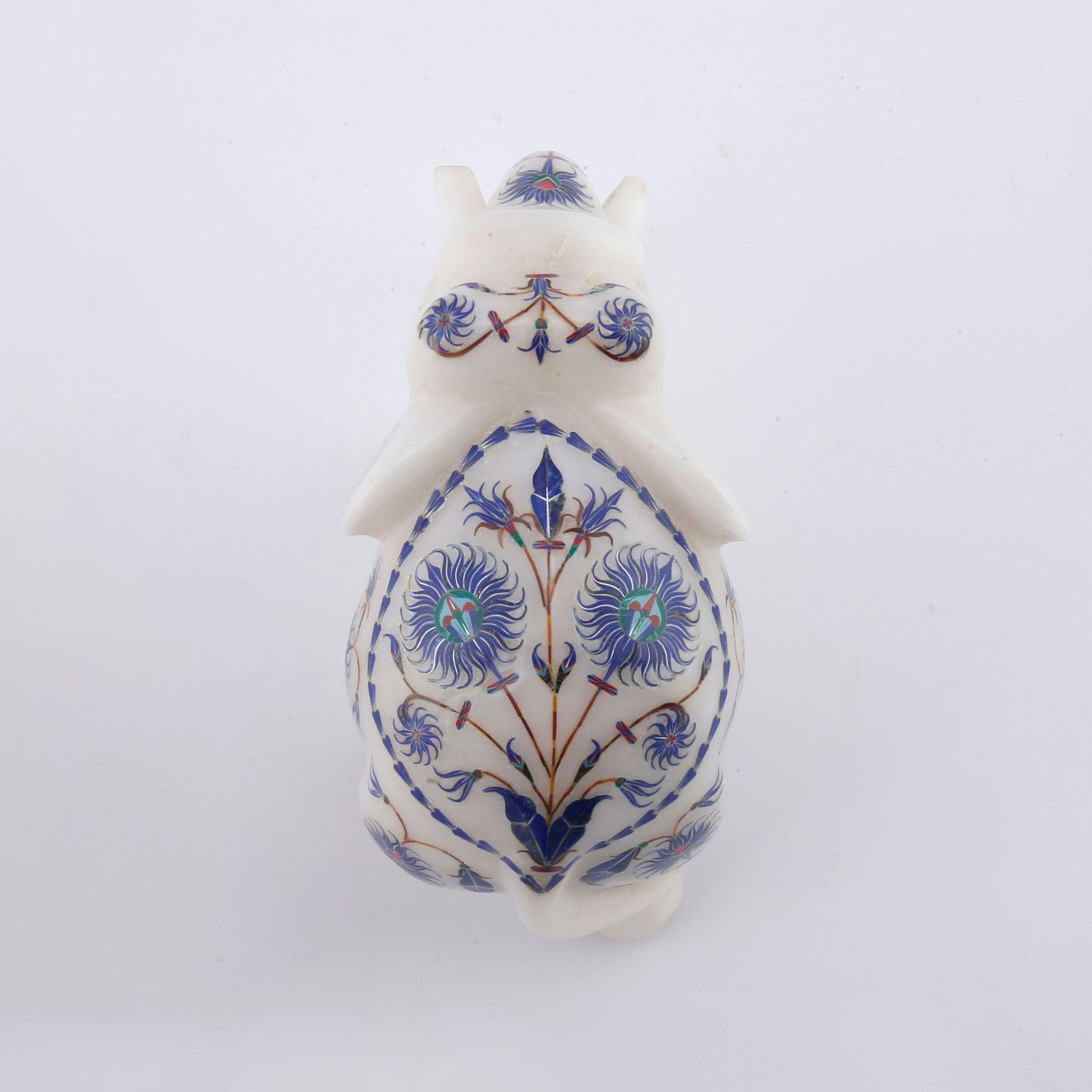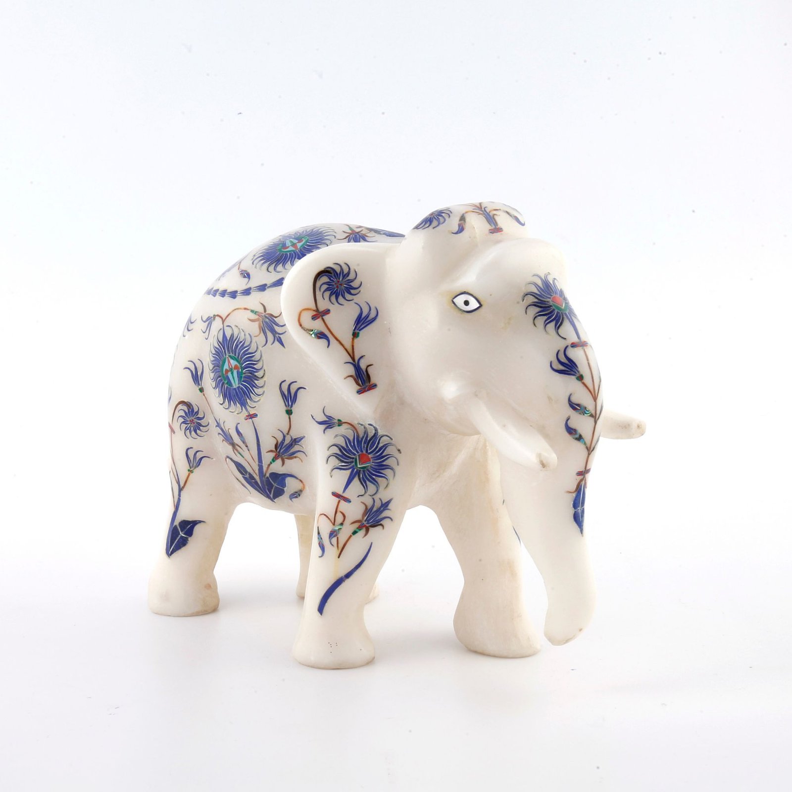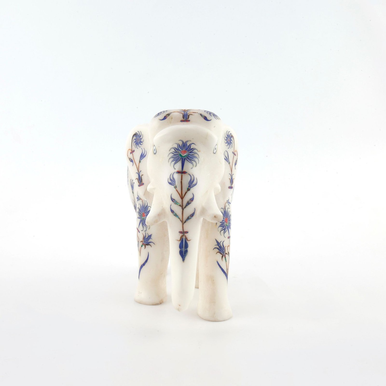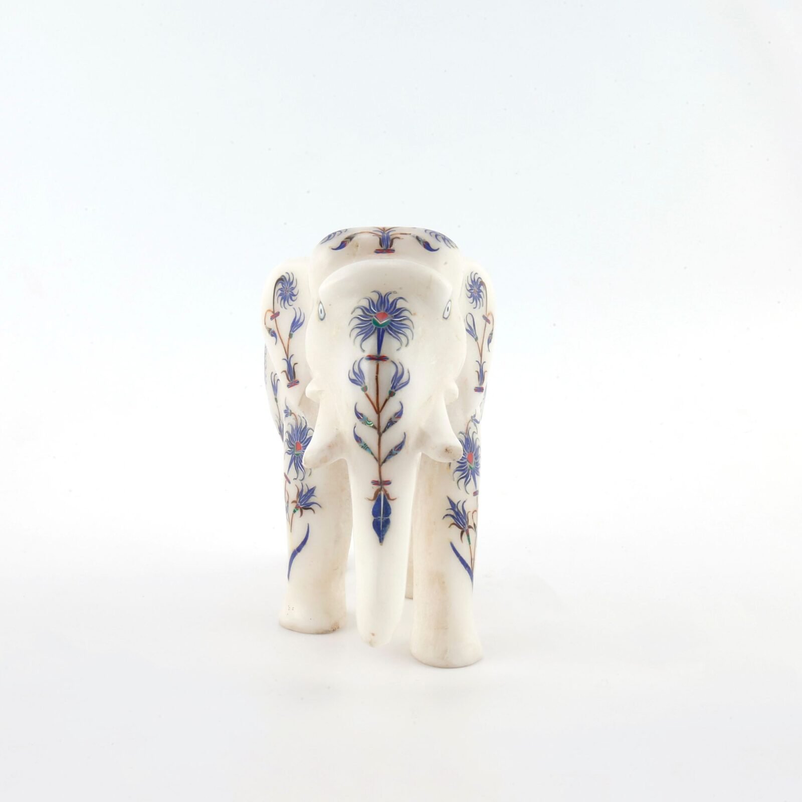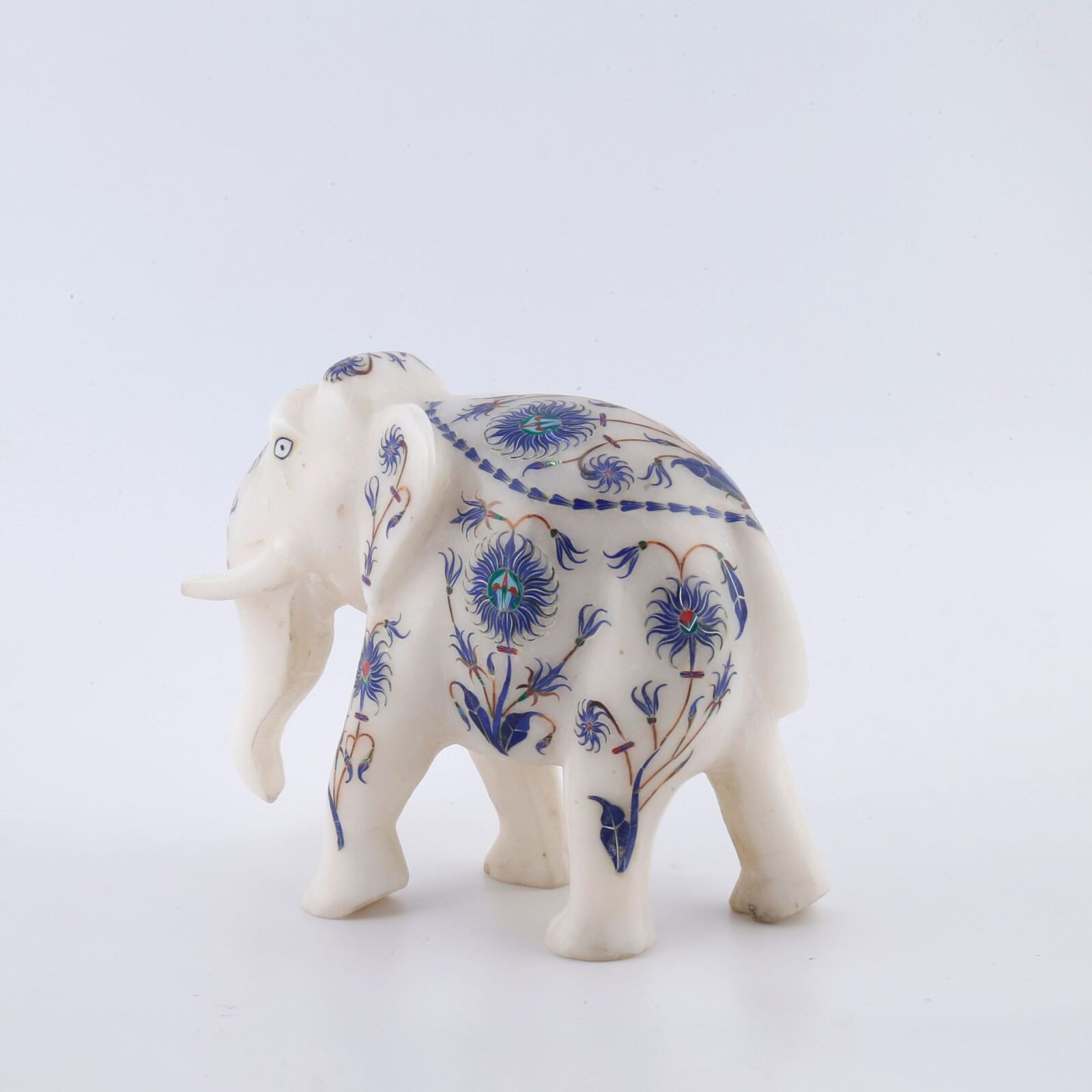 This exquisite white marble elephant figurine is a fine example of traditional Indian craftsmanship, meticulously handcrafted by skilled artisans. Carved from premium quality natural marble, the elephant is adorned with intricate semi-precious stone inlay work, creating a timeless piece of luxury décor.