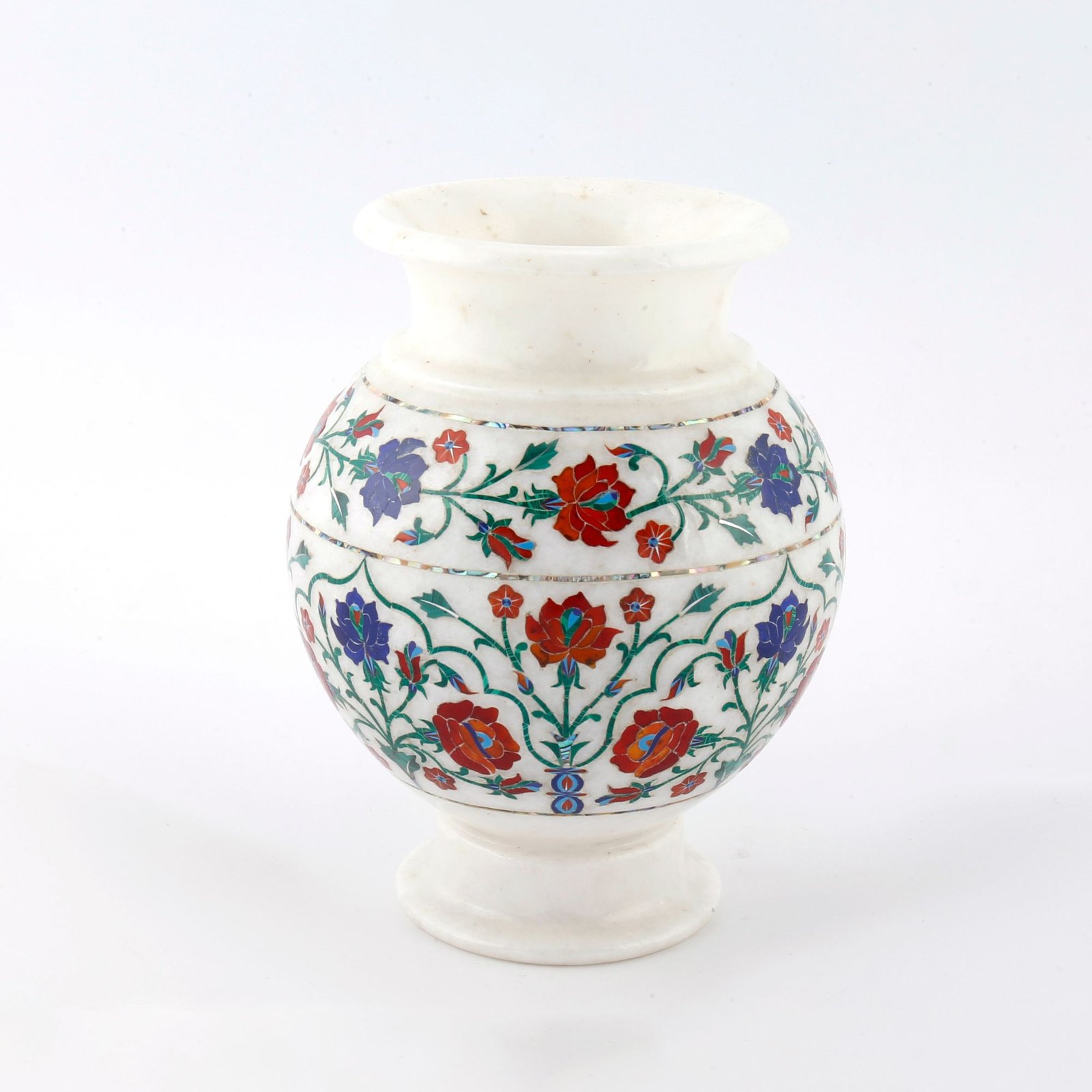 These stones are hand-cut and precisely fitted into the marble using traditional tools, then polished to achieve a smooth, seamless finish. The craftsmanship ensures durability while preserving the natural beauty and color of each stone.