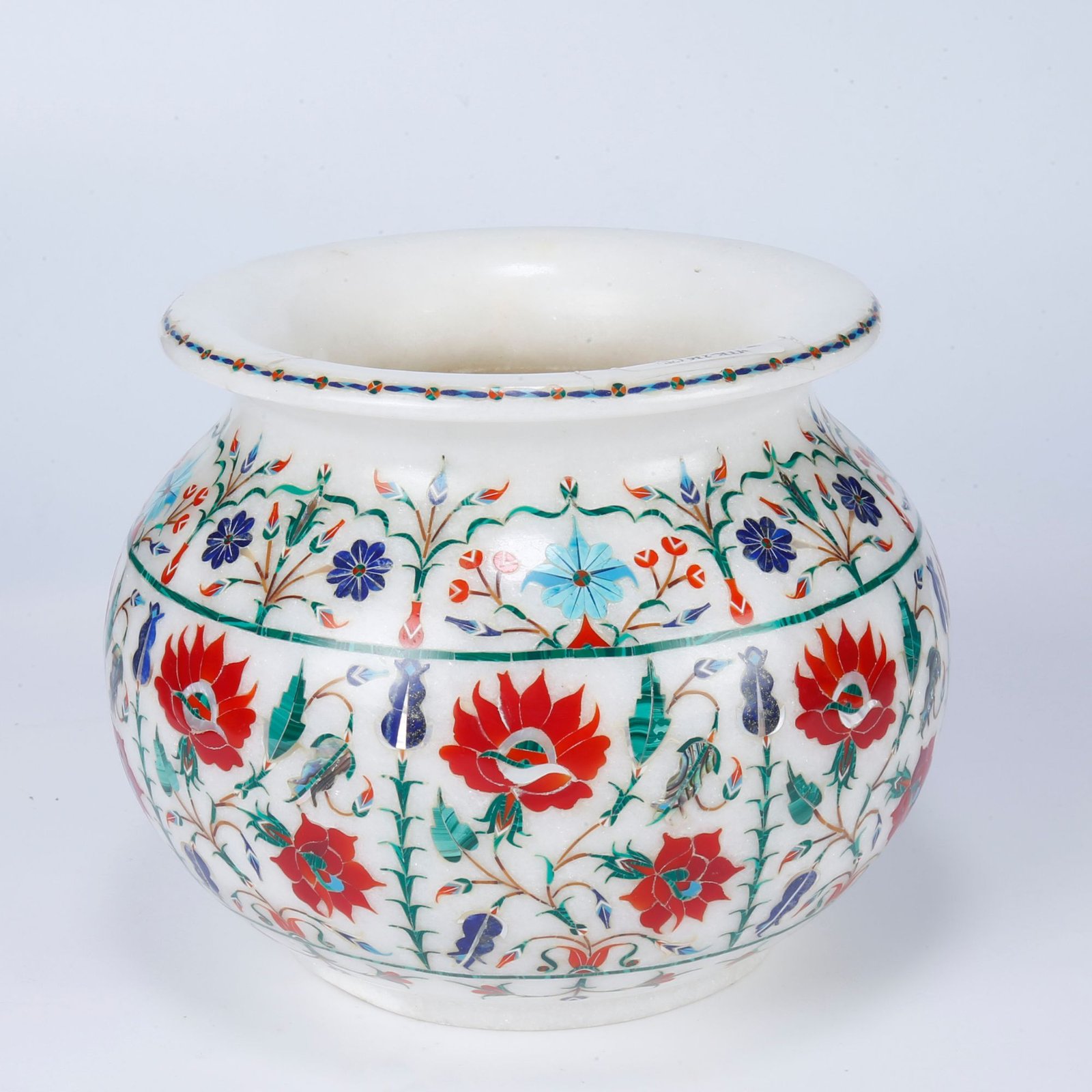 This exquisite handcrafted white marble flower pot is a fine example of traditional Agra pietra dura craftsmanship. Carved from premium natural white marble, the pot features vibrant floral motifs meticulously inlaid by skilled artisans. The symmetrical design and flared rim enhance its elegant silhouette, while the colorful inlay work reflects Mughal-inspired artistry. Each stone is precisely cut and embedded by hand, creating a smooth, polished surface that highlights the brilliance of the semi-precious stones. Ideal for displaying fresh flowers, artificial arrangements, or as a standalone décor accent, this marble flower pot brings timeless luxury to living rooms, entryways, hotels, and heritage interiors.