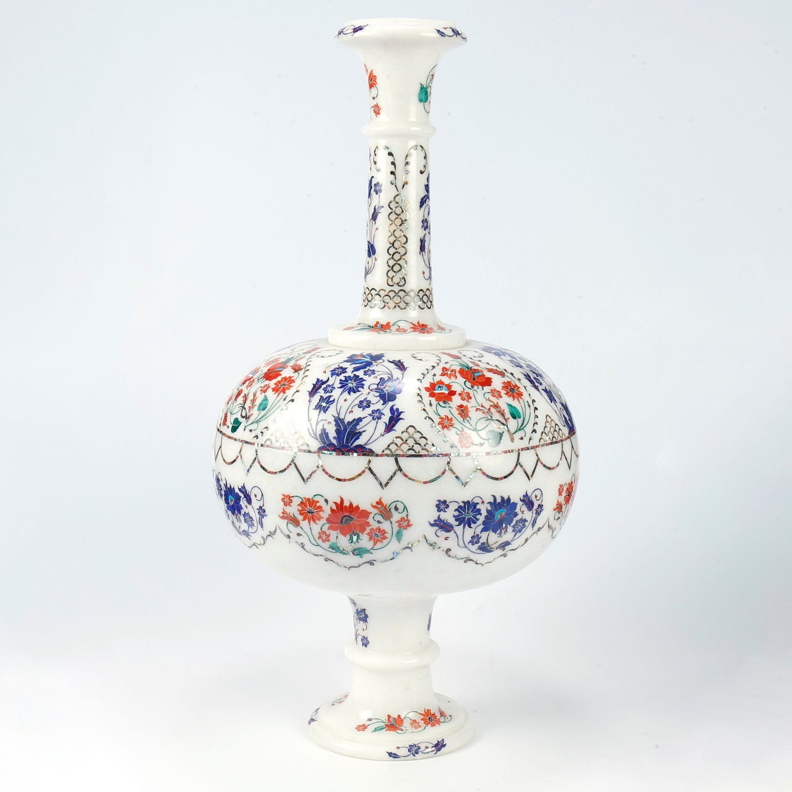 The inlay work is meticulously executed using a selection of natural semi-precious stones, chosen for their vibrant color tones and durability: