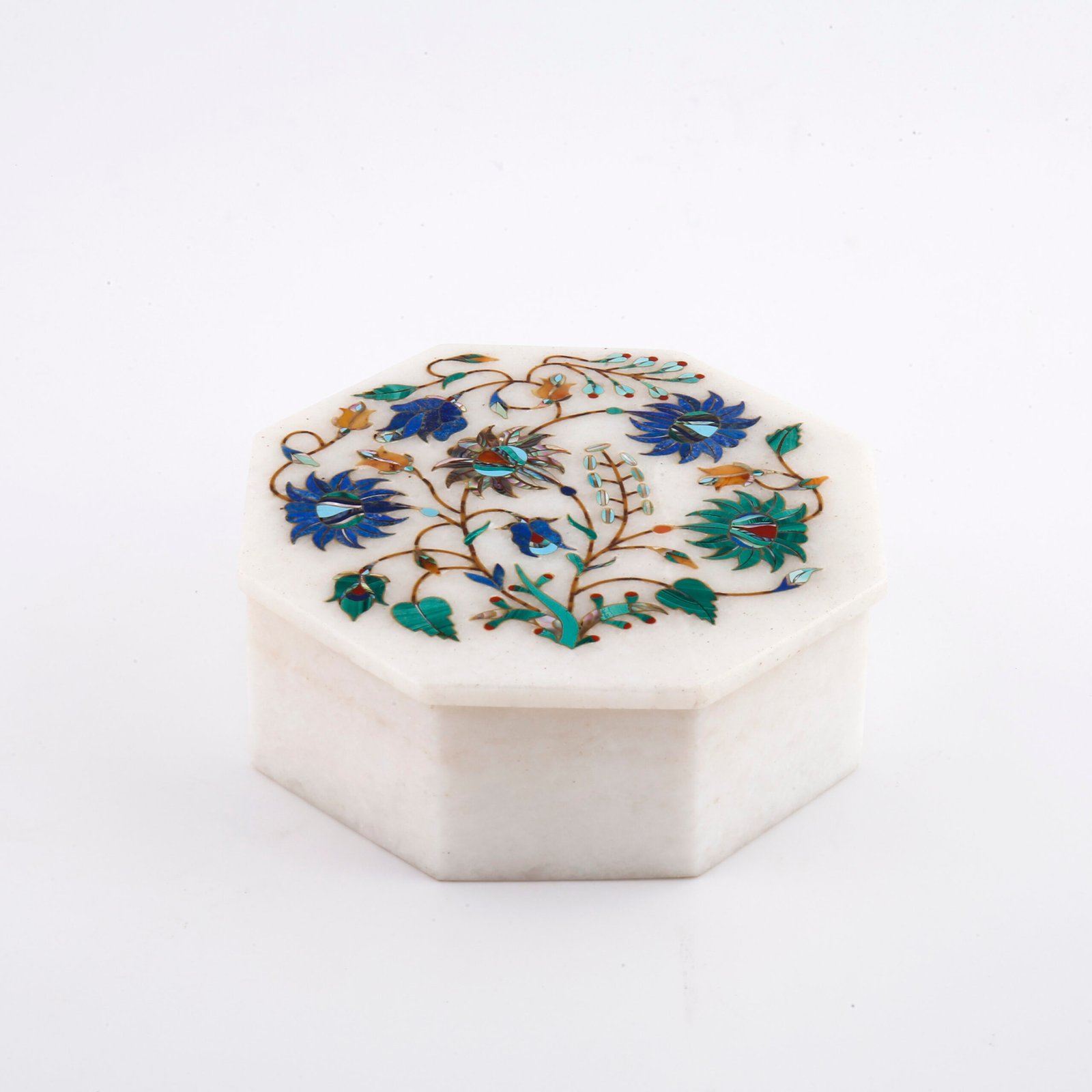 The intricate floral design reflects classic Mughal artistry, where each petal, leaf, and stem is individually hand-cut and precisely set into the marble surface. The octagonal shape adds architectural elegance, making it not only a functional storage box but also a refined décor accent.