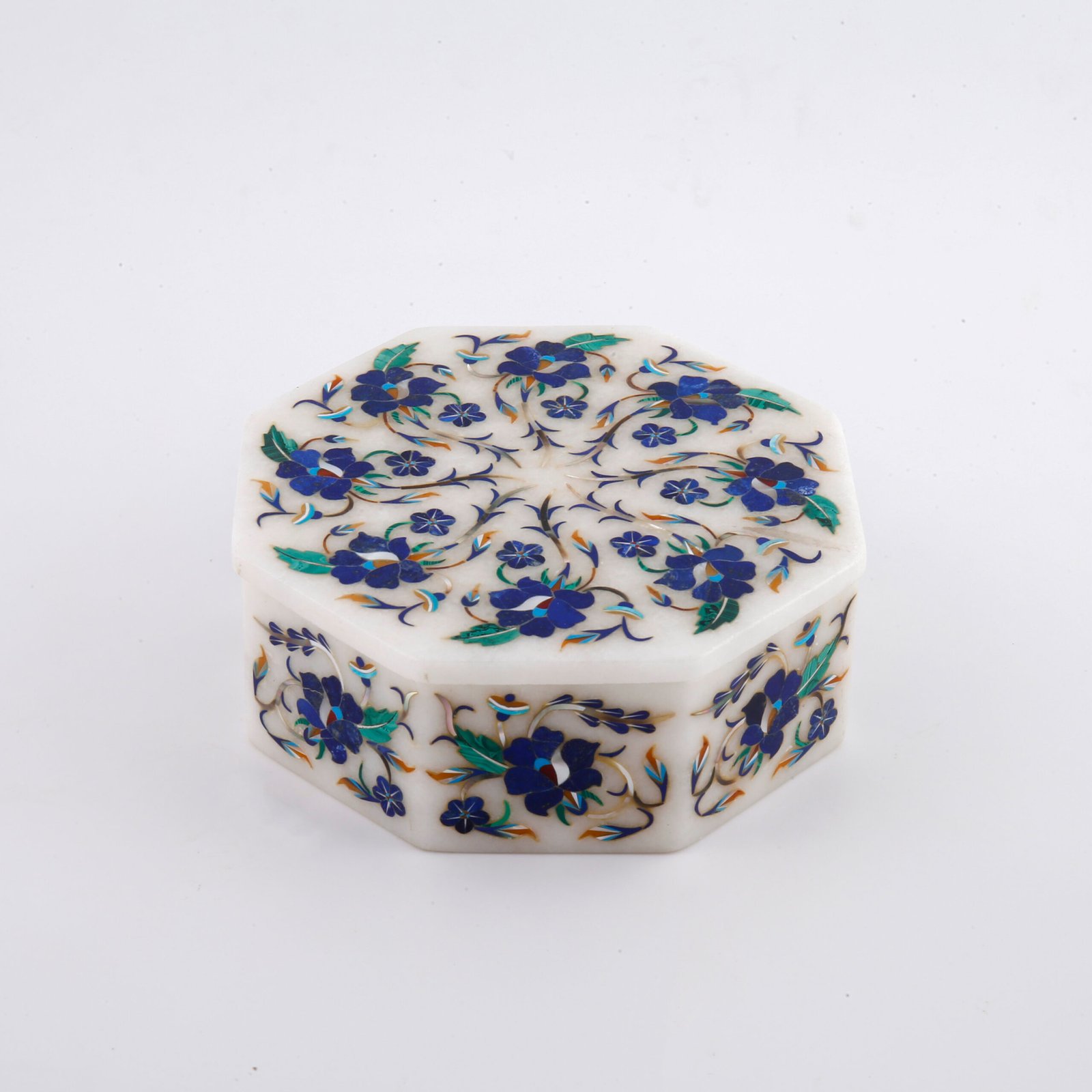 The lid displays a beautifully balanced radial floral composition, where deep blue blossoms and flowing vines form a symmetrical pattern inspired by Mughal garden motifs. Each stone is meticulously hand-cut and delicately embedded into the marble surface, then polished to a smooth, lustrous finish. The octagonal shape adds architectural elegance, enhancing its luxury appeal.