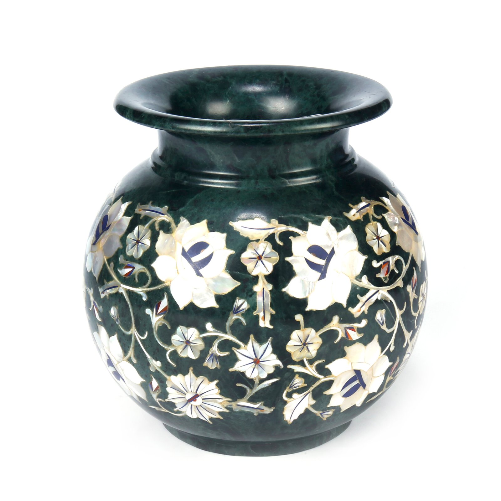 This pot features authentic, hand-cut semi-precious stones traditionally used in Mughal-era inlay art: