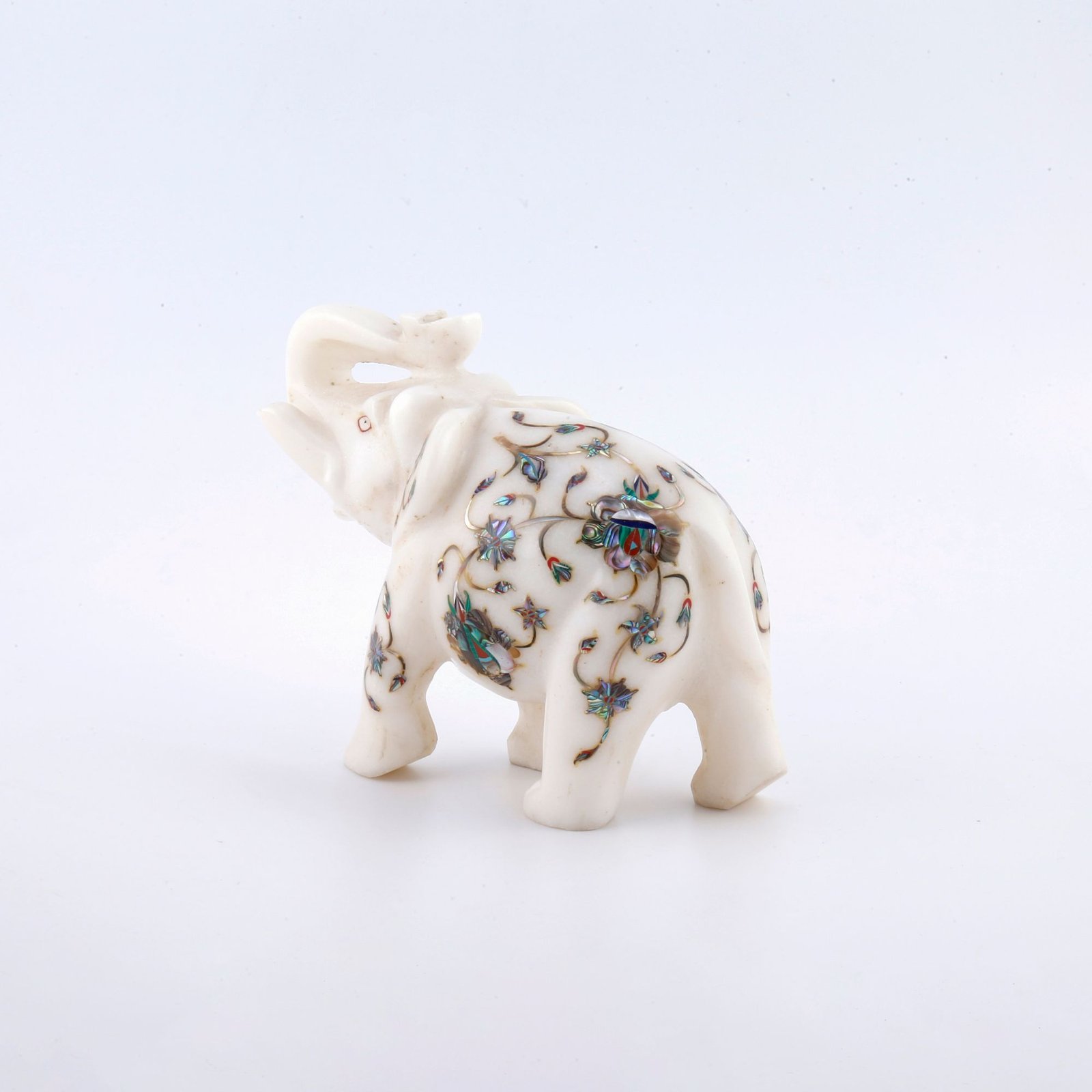 Luxury White Marble Elephant Figurine with Mother of Pearl & Onyx Floral Inlay | Handcrafted Pietra Dura Art