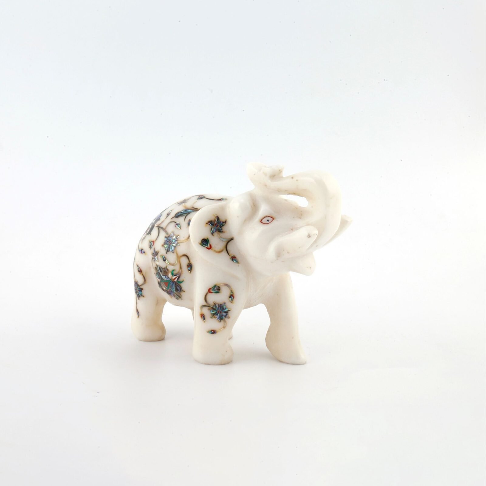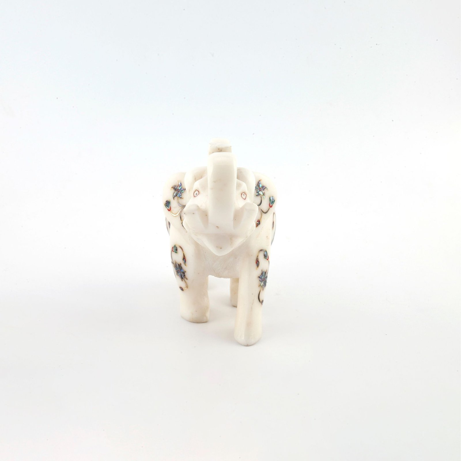 This elegant white marble elephant figurine is a fine example of traditional Indian Pietra Dura craftsmanship. Expertly hand-carved from high-quality natural white marble, the sculpture features a raised trunk posture, symbolizing good luck, prosperity, and positive energy. The smooth polish enhances the natural translucency of the marble, giving the piece a refined and timeless appeal.