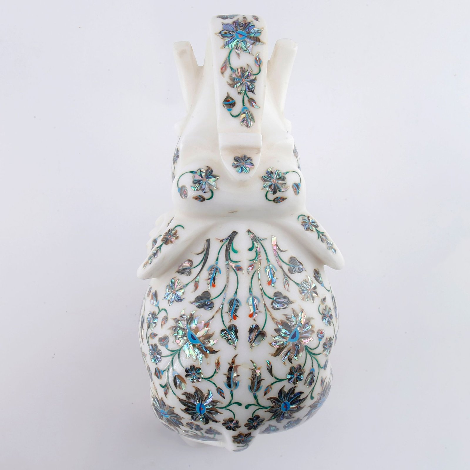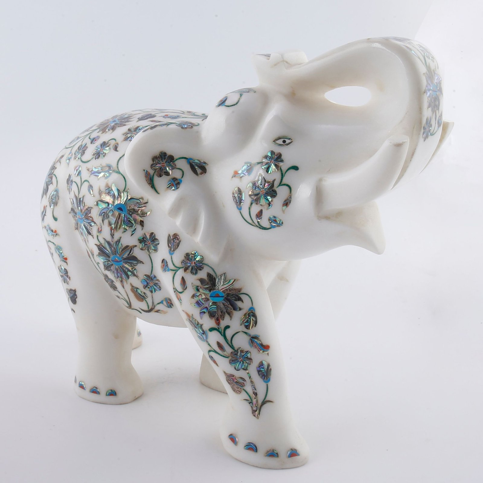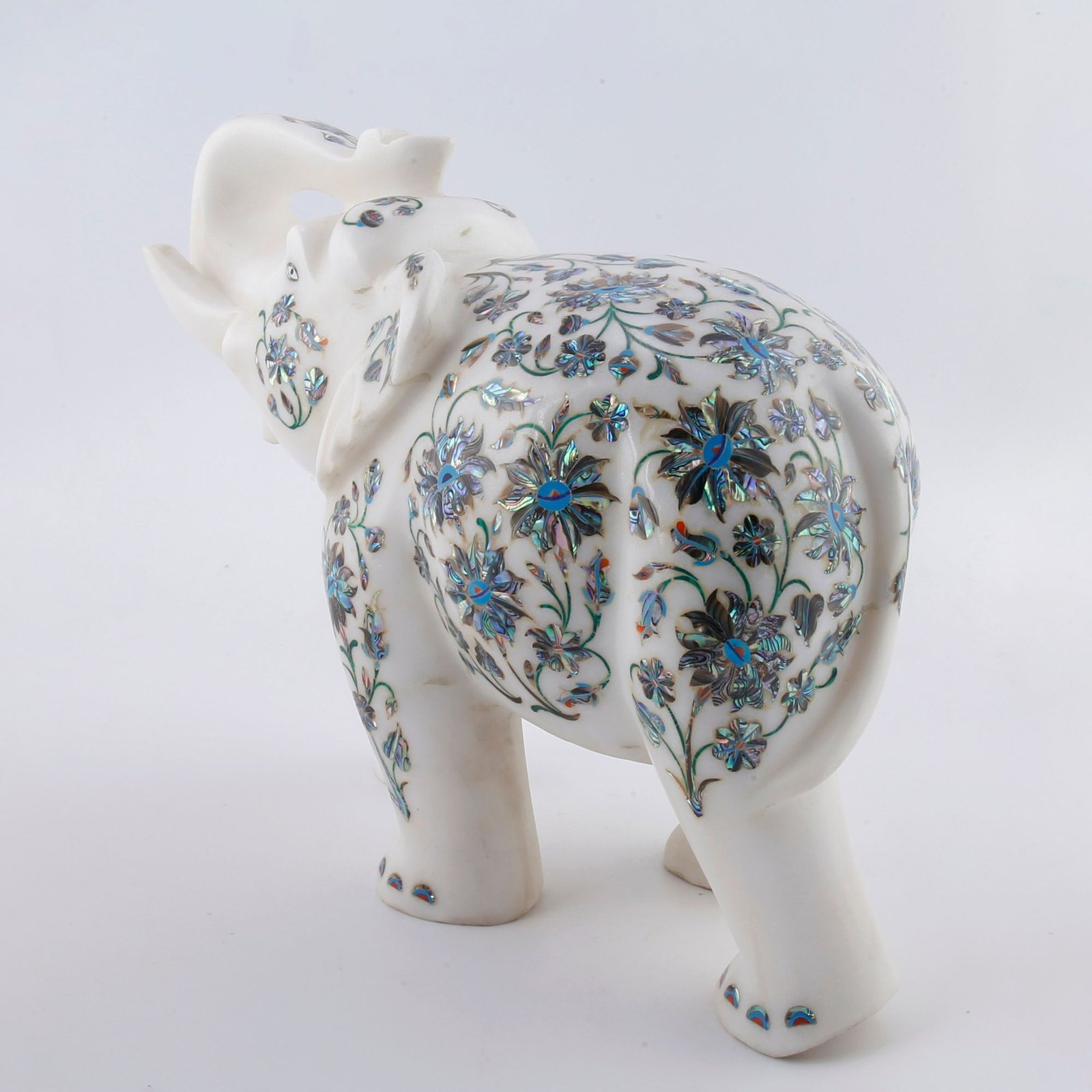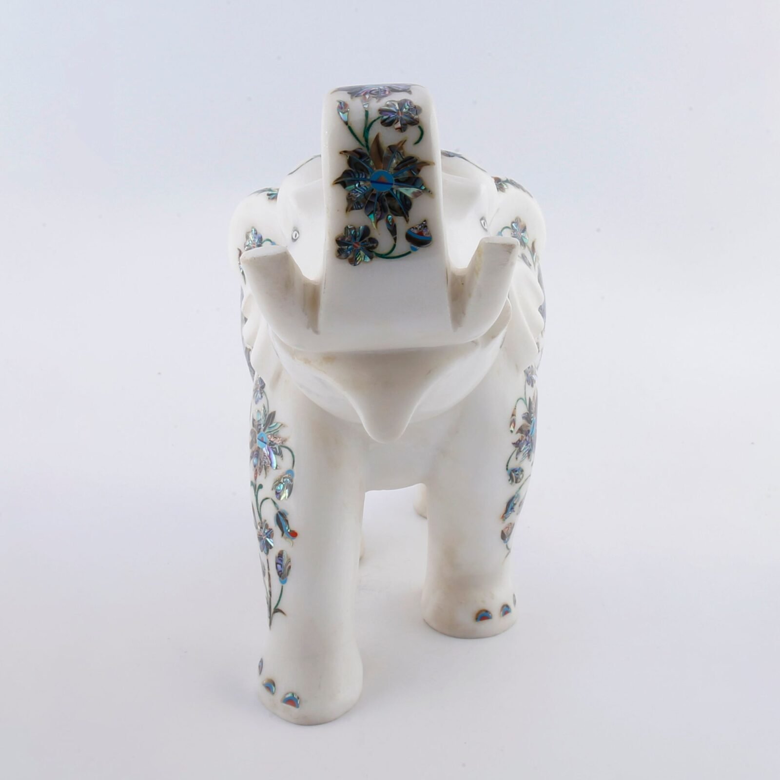 Luxury White Marble Elephant Showpiece with Mother of Pearl Floral Inlay | Handcrafted Semi-Precious Stone Pietra Dura Art