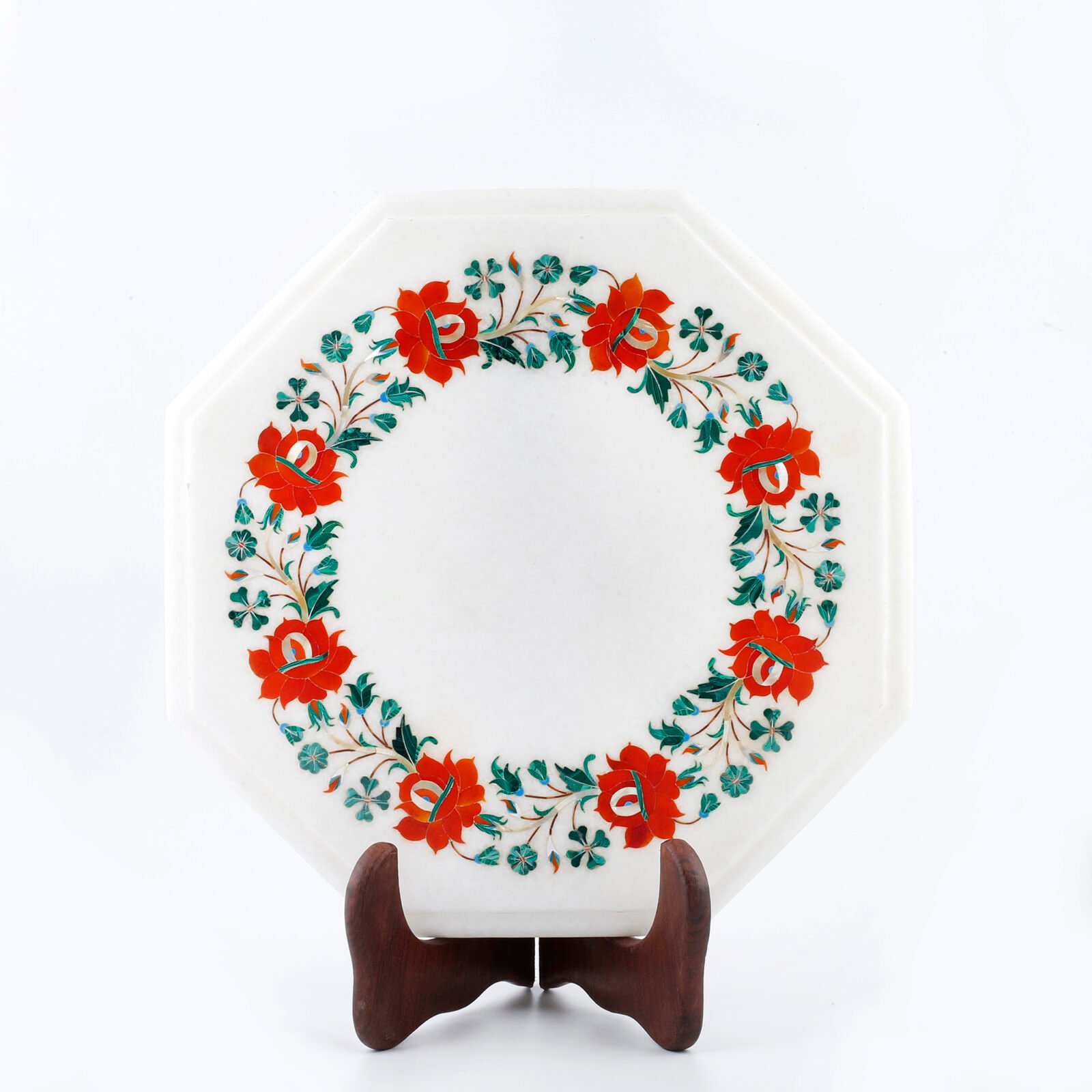 This elegant octagonal white marble plate is a refined example of traditional Pietra Dura (marble inlay) craftsmanship, handcrafted by master artisans of Agra. Made from premium-quality Makrana white marble, the plate features a beautifully balanced circular floral wreath design set within an octagonal frame, creating a harmonious blend of geometry and organic form.