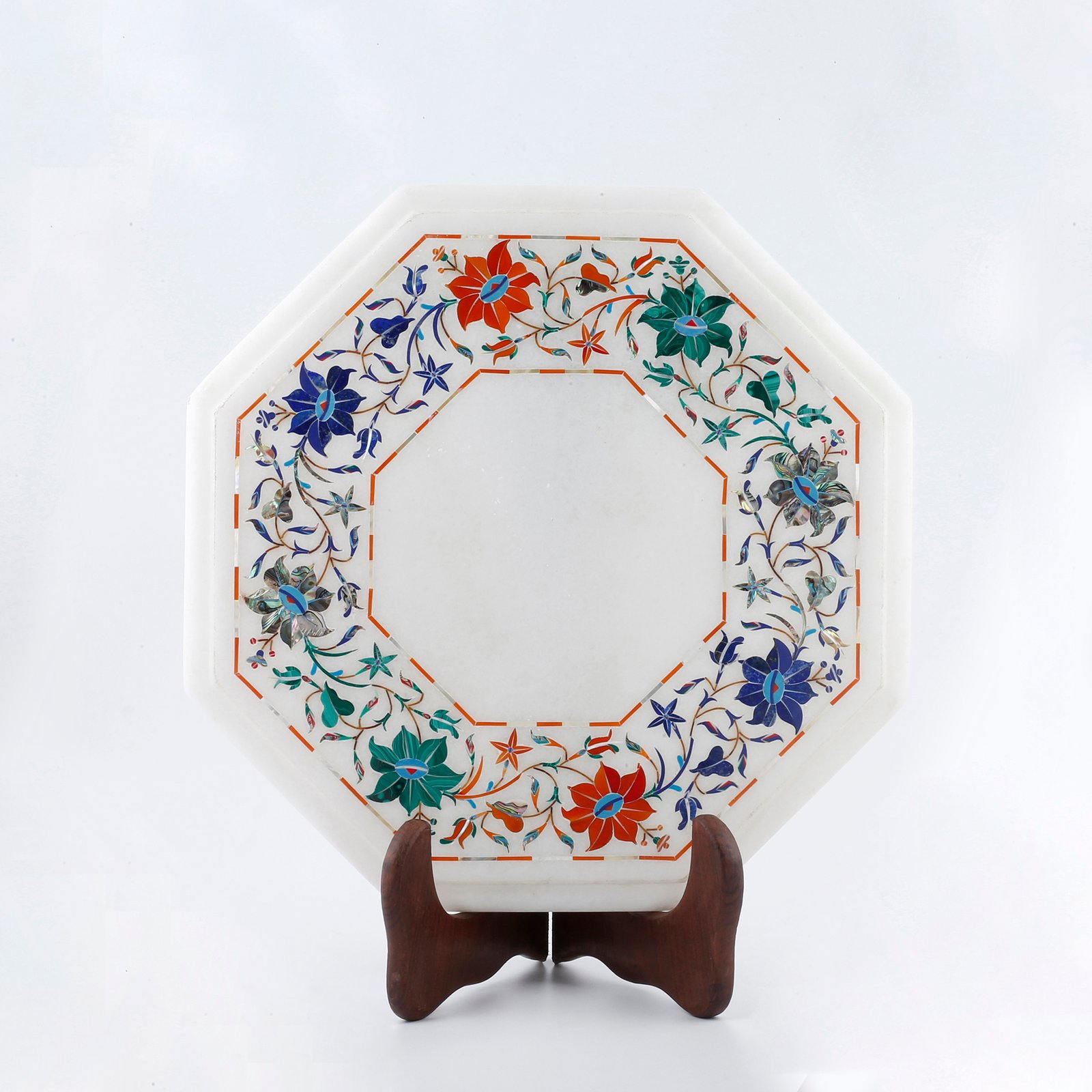 This marble plate is adorned with carefully selected natural stones, traditionally used in Mughal marble inlay art: