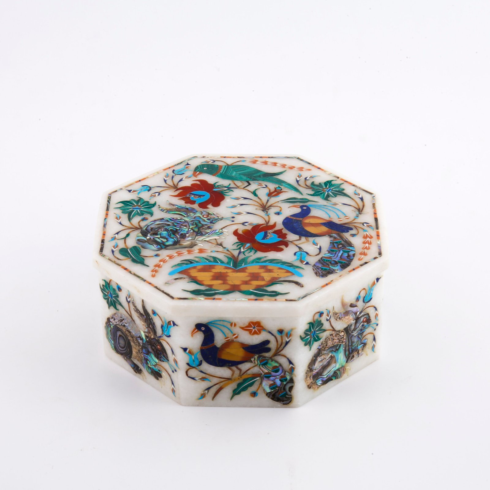 This elegant octagonal white marble jewelry box is a timeless representation of India’s world-famous Pietra Dura (stone inlay) artistry, meticulously handcrafted by master artisans in Agra. Sculpted from premium Makrana white marble, the same marble historically used in the Taj Mahal, this piece blends architectural heritage with fine decorative craftsmanship.