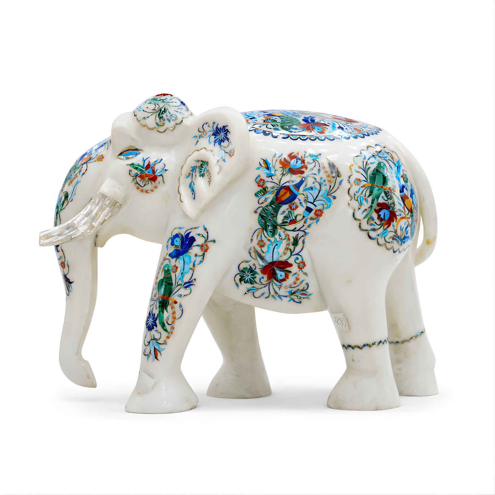 Showcasing timeless elegance and royal craftsmanship, this handcrafted white marble elephant figurine is a masterpiece of traditional Pietra Dura (marble inlay) art. Created by skilled artisans from Agra, this sculpture reflects the same intricate inlay technique seen in the iconic Taj Mahal.